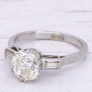 [message]An antique Art Deco engagement ring featuring a beautiful antique old mine cut diamond. The diamond is secured by six split claws in a platinum collet featuring decorative scroll detailing in the gallery. Two internally clean and icy baguette cut diamonds flank the centre stone, and conform to a slim D-shaped platinum shank.