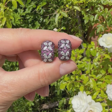 A daring, unusual and very, very beautiful pair of diamond and pink sapphire earrings. Each shell shaped earring is set with eight incredibly white (graded D to E) marquise cut diamonds arranged in two 'X' formations, and surrounded by 44 bright purply-pink sapphires. The 18k gold settings have been plated in black rhodium, lending these earrings a certain edge, as well as giving all the gems fantastic background on which to really pop.