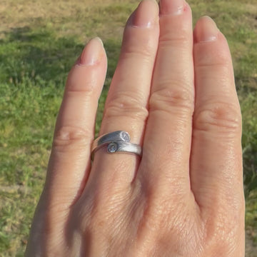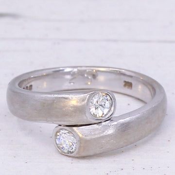 [message]A sleek modern diamond ring. The chunky, D-shaped white gold band bypasses itself, with a pair of high white, clean and bright round brilliant cut diamonds set at each end. The satin finish to the metal allows the diamonds to "pop" and lends the ring understated class.