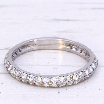 [message]A beautifully made eternity ring set with 60 white and lively diamonds in 18k white gold. The knife edge band is pavé set with two rows of round brilliant cut diamonds either side of the milgrained ridge. Would make an ideal stacking ring, but is certainly substantial and important enough to wear on its own.
