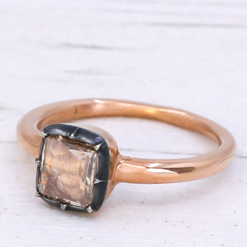 [message]A wonderfully unique rose cut diamond in a wonderfully pretty setting created in the early Georgian style. The diamond - graded by GIA as fancy orange brown - displays a gorgeous autumnal glow. The stone is secured in a cut-down setting in oxidised silver within a closed, button-back setting. On a slim, 18k rose wire shank.
