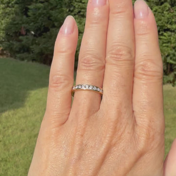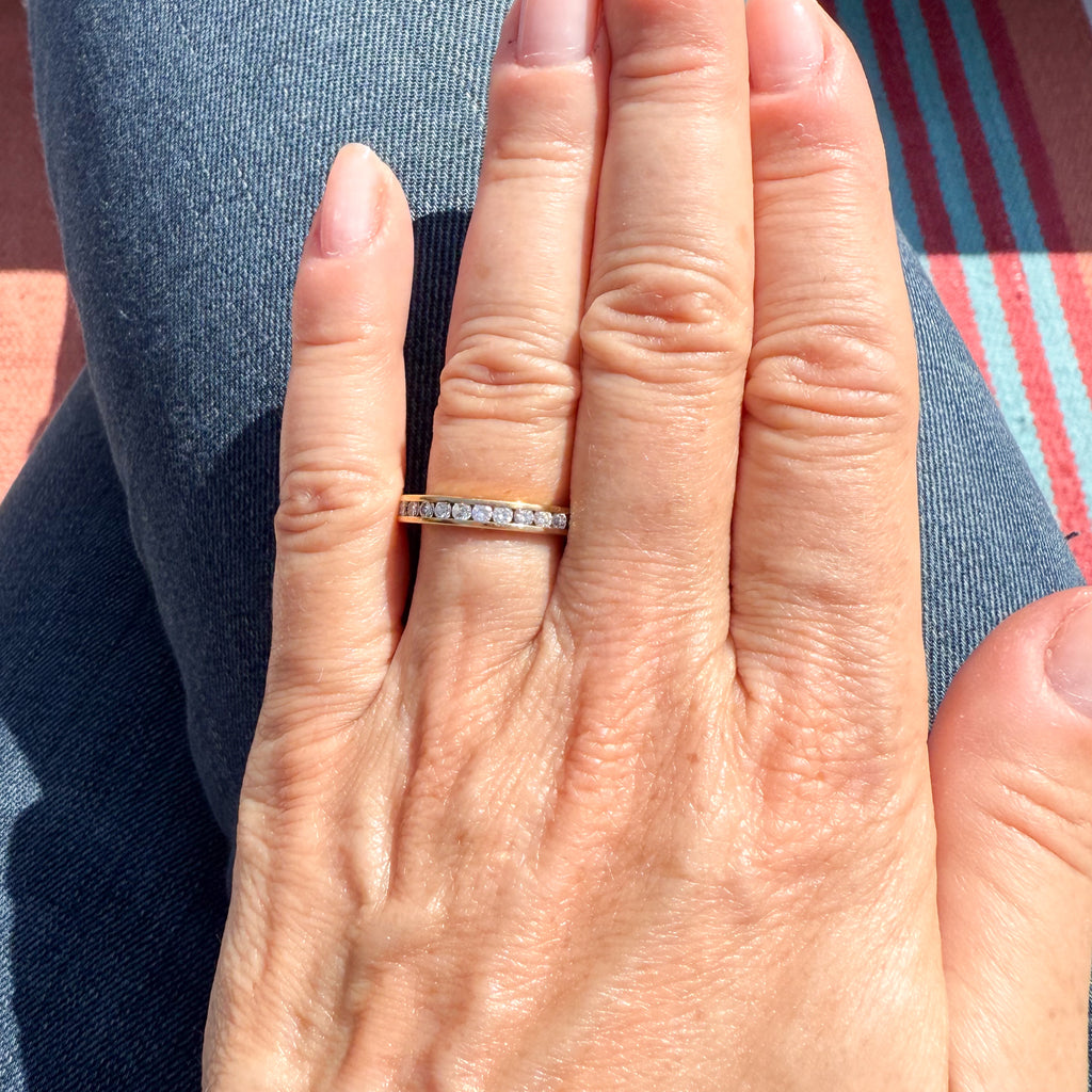[message]A super pretty diamond eternity ring. With twenty-eight white and bright brilliant cut diamonds channel-set in 18k yellow gold band. Would work equally as well stacked with other rings as it would on its own.