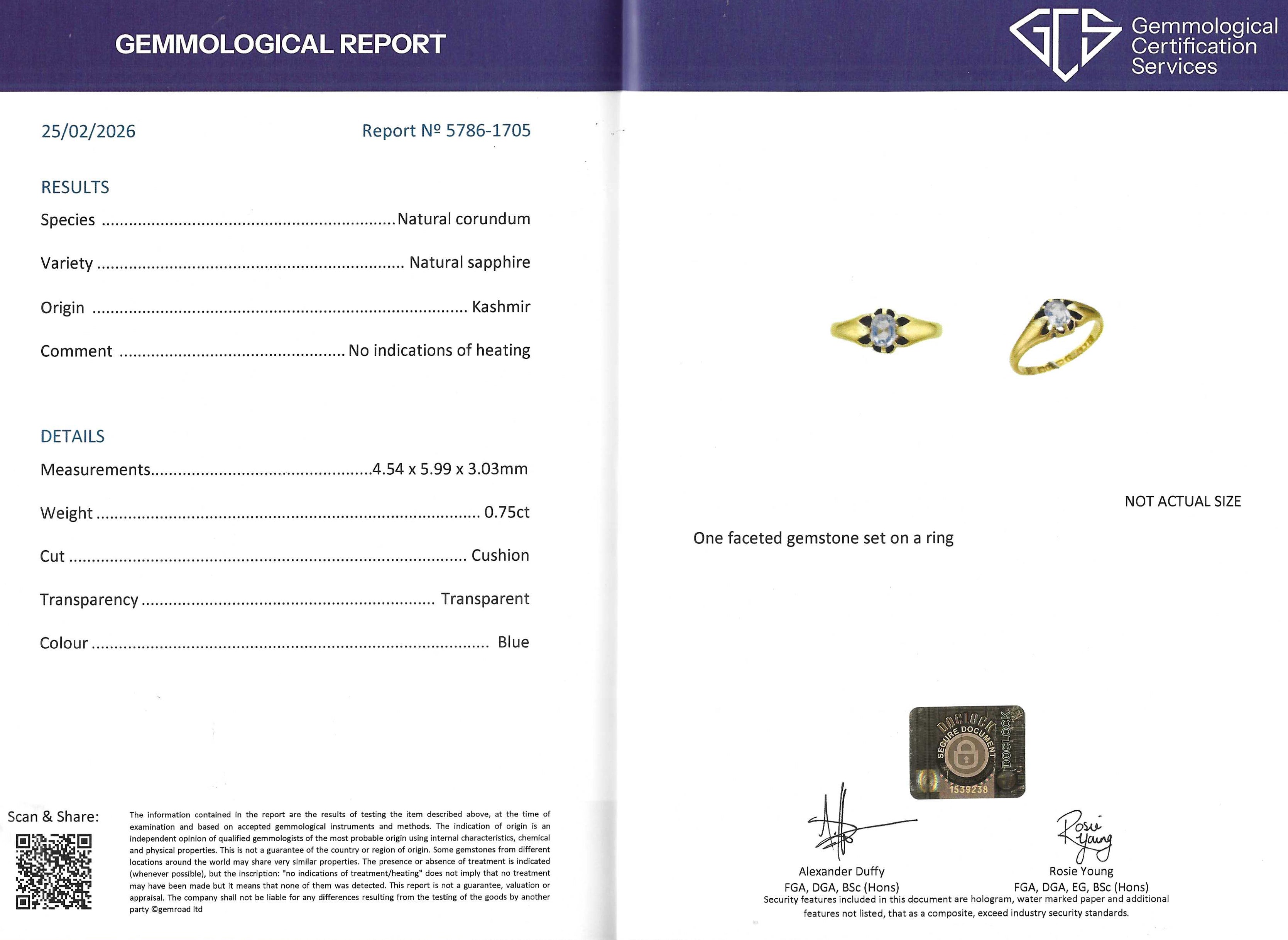 Accompanied by a report from Gemmological Certification Services (GCS) stating the sapphire shows no indication of heating, and originates from Kashmir.