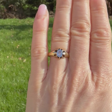 [message]One of the rarest and perhaps the most prized gemstones in the world is an unheated sapphire from Kashmir. This bright, cornflower blue stone sits within a sold, 18k yellow gold mount and is secured by 8 curving claws which flow to a D-shaped shank.