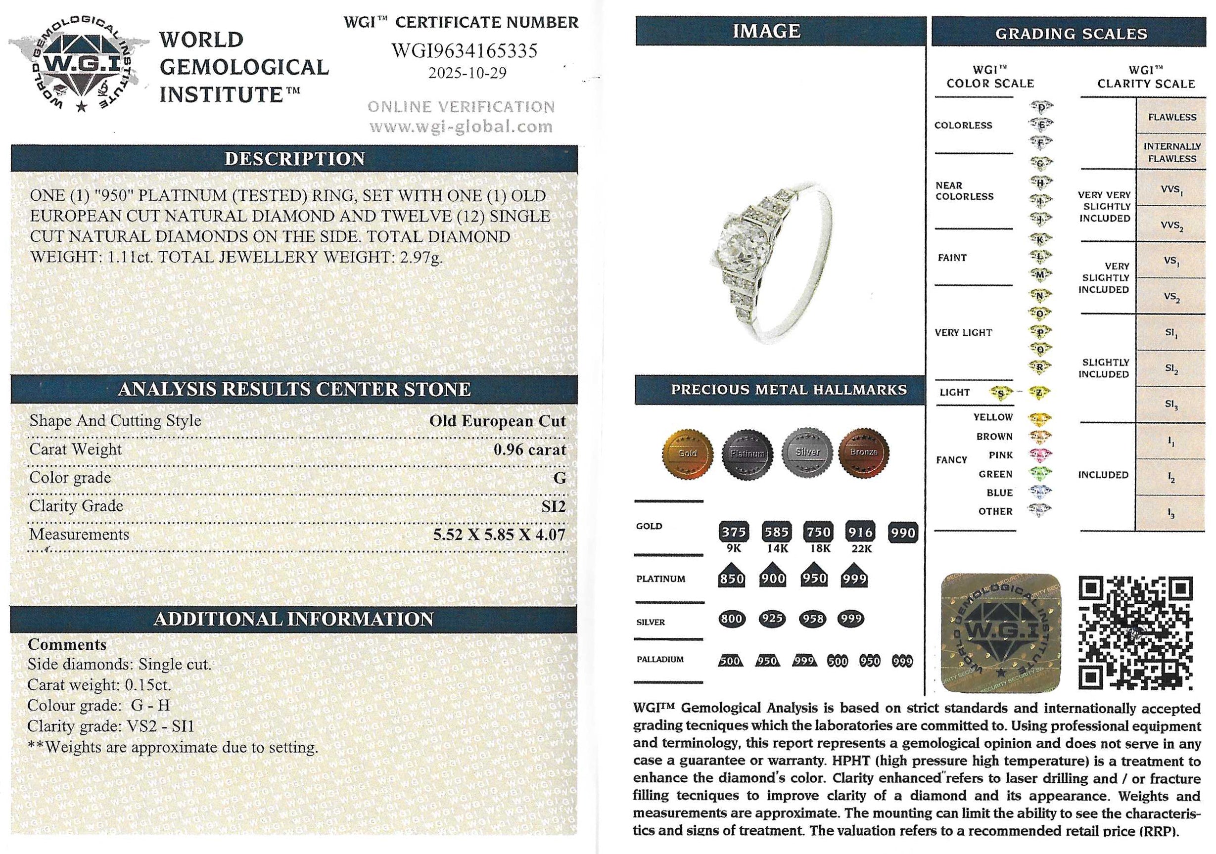 [message]A superb Art Deco diamond engagement ring. The slightly cushion-shaped old European cut diamond in the centre is secured within a square collet, with step-down shoulders set with 12 (six each side) eight-cut diamonds, leading to a slender platinum shank. A ring featuring the clear, strong lines associated with Art Deco jewellery.