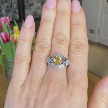 [message]An absolutely wonderful antique ring. The bright, daffodil yellow sapphire n the centre - certified by GIA as natural, unheated and originating from Ceylon (Sri Lanka) - “floats” within a lateral marquise set with fourteen eight-cut diamonds and six natural, blue sapphires. All the stones are set silver within a simple split rose gold gallery, leading to a slender band. Utterly charming and wholly unique.