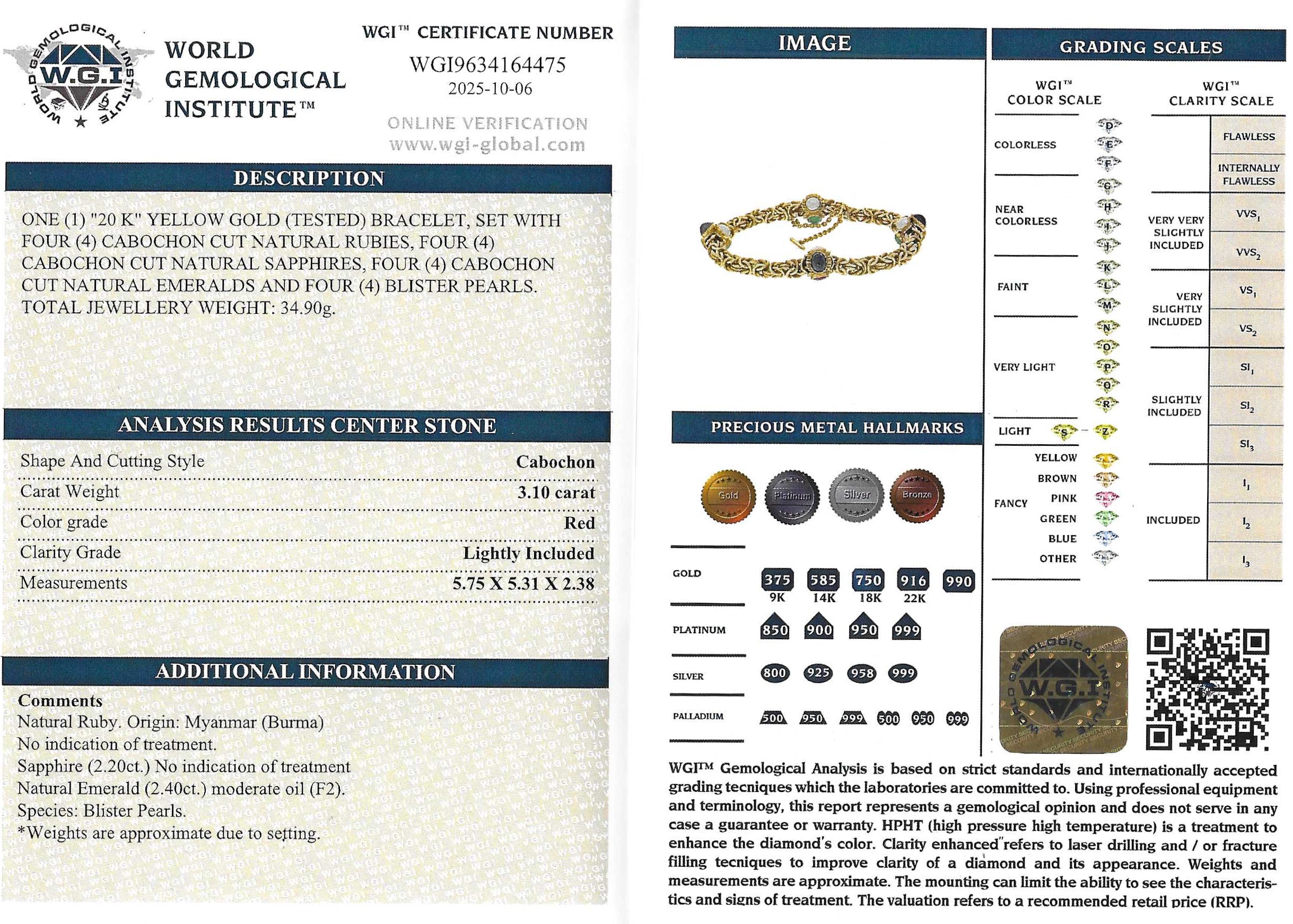 [message]An important - and dramatically beautiful - Art Deco bracelet. The heavy byzantine chain is crafted in 19.2k yellow gold (a standard purity in Portugal) and is interrupted by four boxes, each set with an unheated Burmese ruby, an unheated sapphire, a natural emerald (moderate oiling), and a natural blister pearl. An absolute treasure.