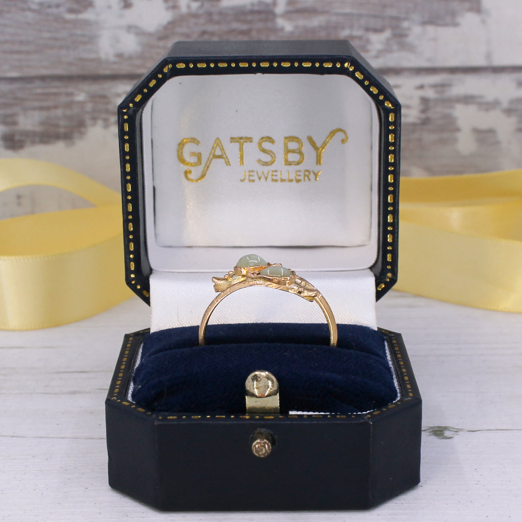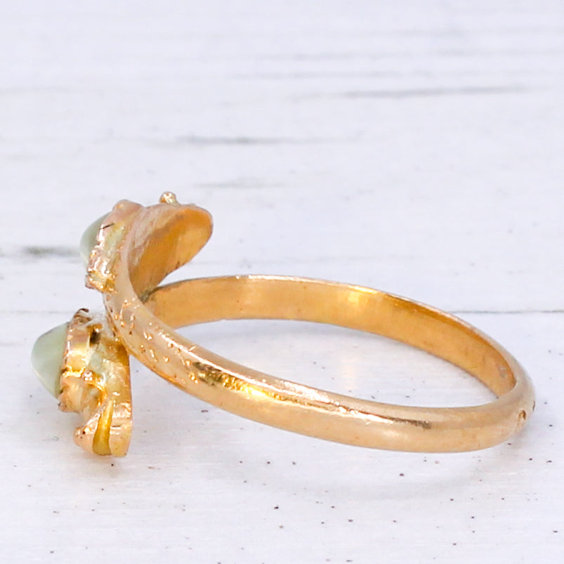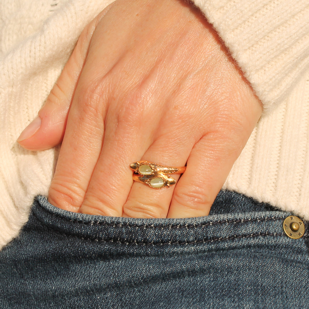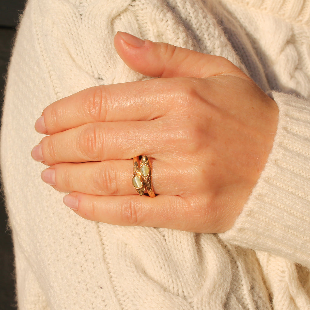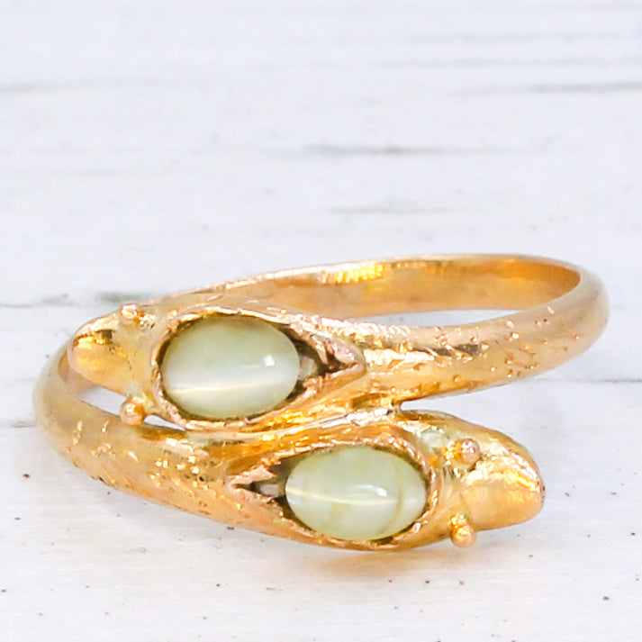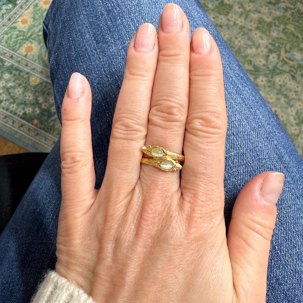 [message]A wonderfully characterful bypass ring featuring a double headed snake, with each head topped with green cay's eye chrysoberyl, both displaying a clear and strong chatoyancy line.