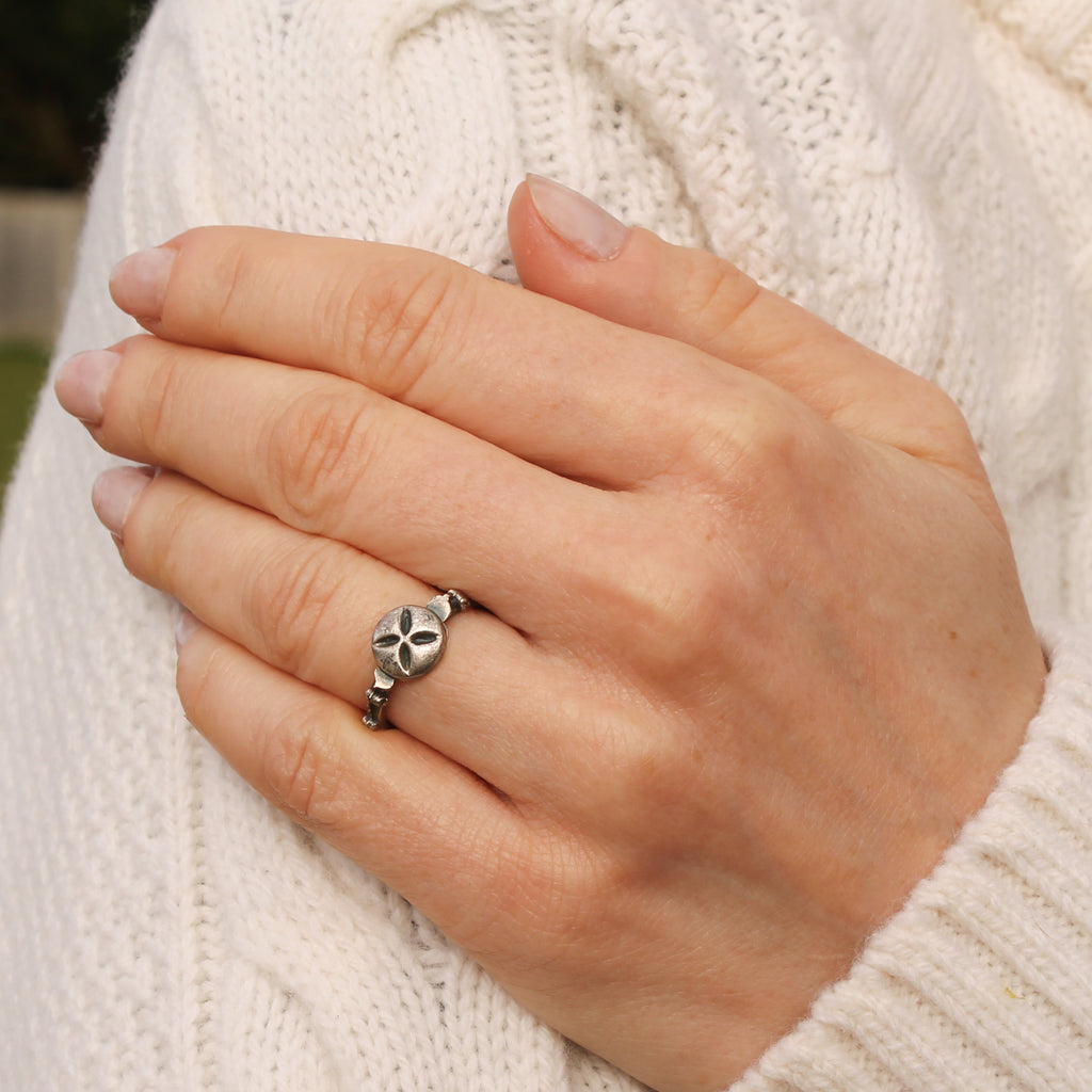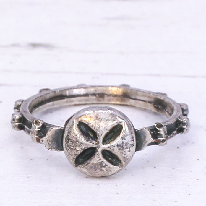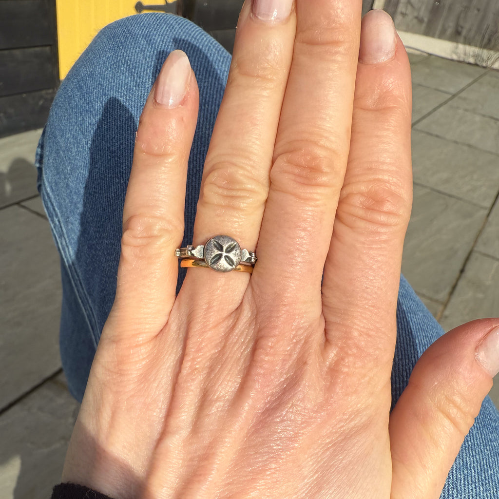 [message]With ten projections and topped with a round plate featuring a rudimentary cross, or 'X'. Rosary or Decade rings date from the 16th century until well into the 18 century, and were used in place of rosaries by members of the Roman Catholic faith during the religious upheavals of this period. Such rings would have been more easily hidden than rosary beads, and this might also explain why the cross on this ring features as an 'X'.