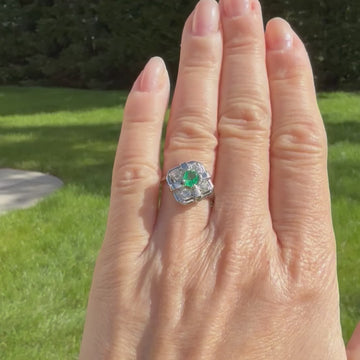 An achingly pretty Art Deco emerald ring. The Colombian emerald in the centre is the perfect colour; a rich, bright, and verdant green. Four high white diamonds are set in the surround, with wide band of platinum between each stone. A hand-sawn star-shaped under-gallery leads to a slim platinum shank. A stunner of a ring.