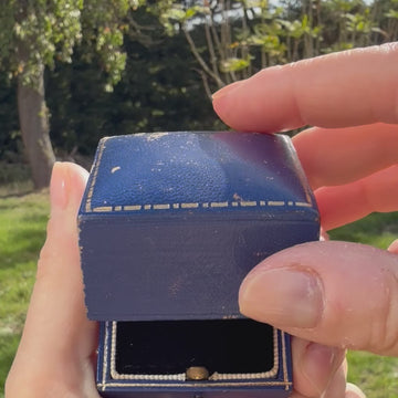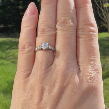 A classic vintage engagement ring set with an absolute firecracker of a diamond. The old European cut in the centre has been assessed as E/F colour which is unusually white and bright for an old cut. The stone is secured in a six claw platinum coronet collet and is flanked on either side by diamond set shoulders, leading to a D-shaped 18k white gold shank.