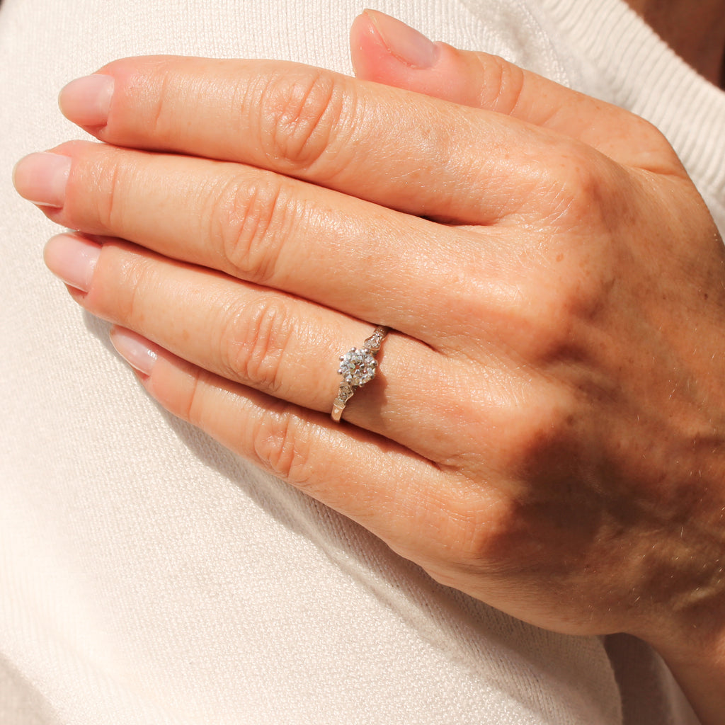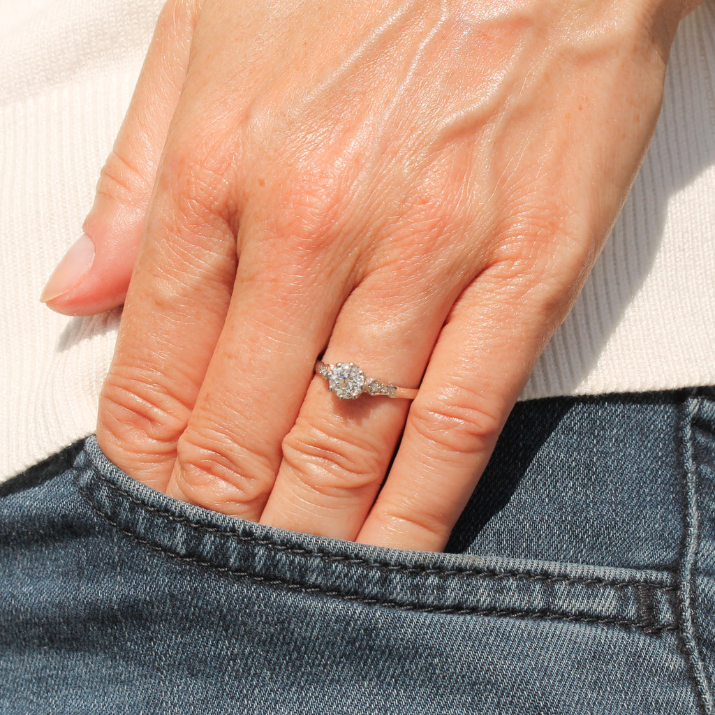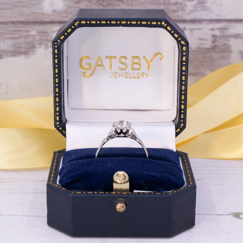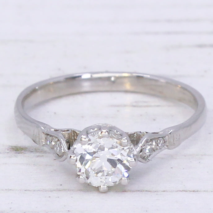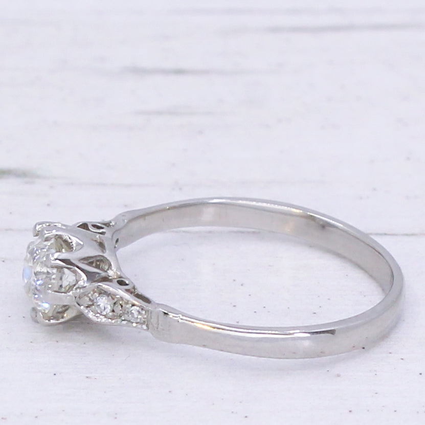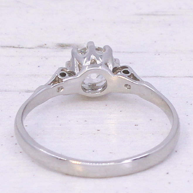 [message]A truly lovely old European cut diamond engagement ring. The 0.62 carat diamond in the centre - graded by De Beers as I colour, SI2 clarity - is secured in an eight-claw platinum collet. The wide, spear-shaped shoulders are set with four (two either side) eight-cut diamonds, leading to a slender D-shaped platinum shank.