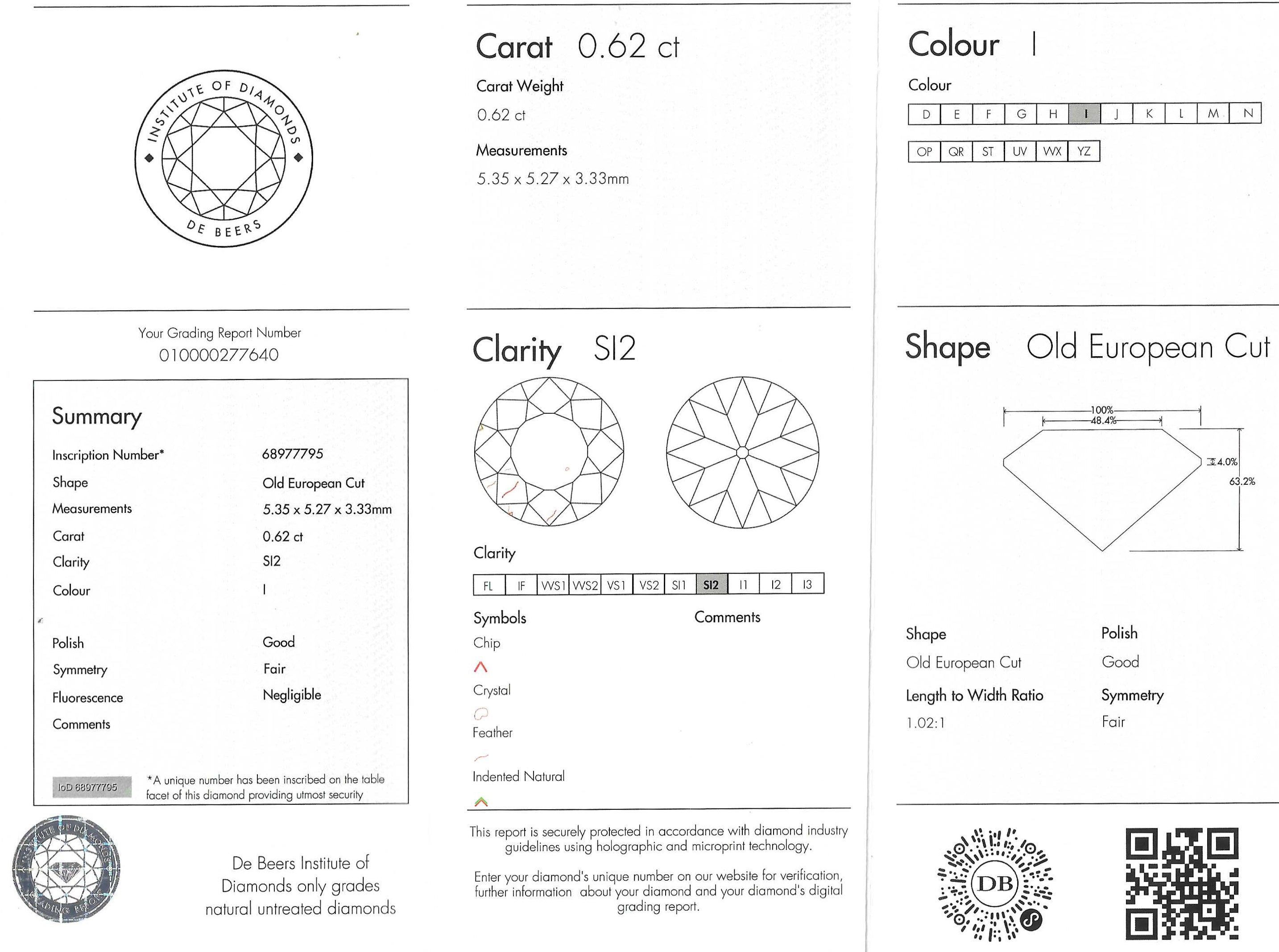 Accompanied by a De Beers Institute of Diamonds grading report. A unique number has been inscribed on this diamond providing utmost security.