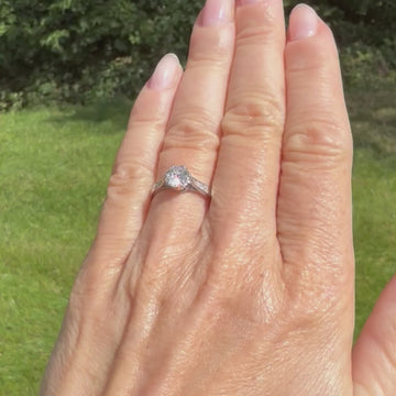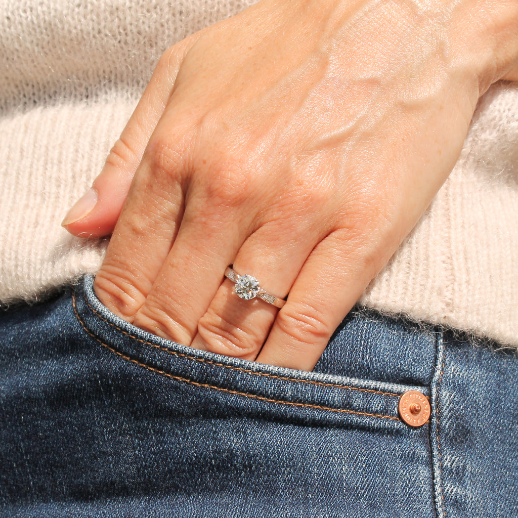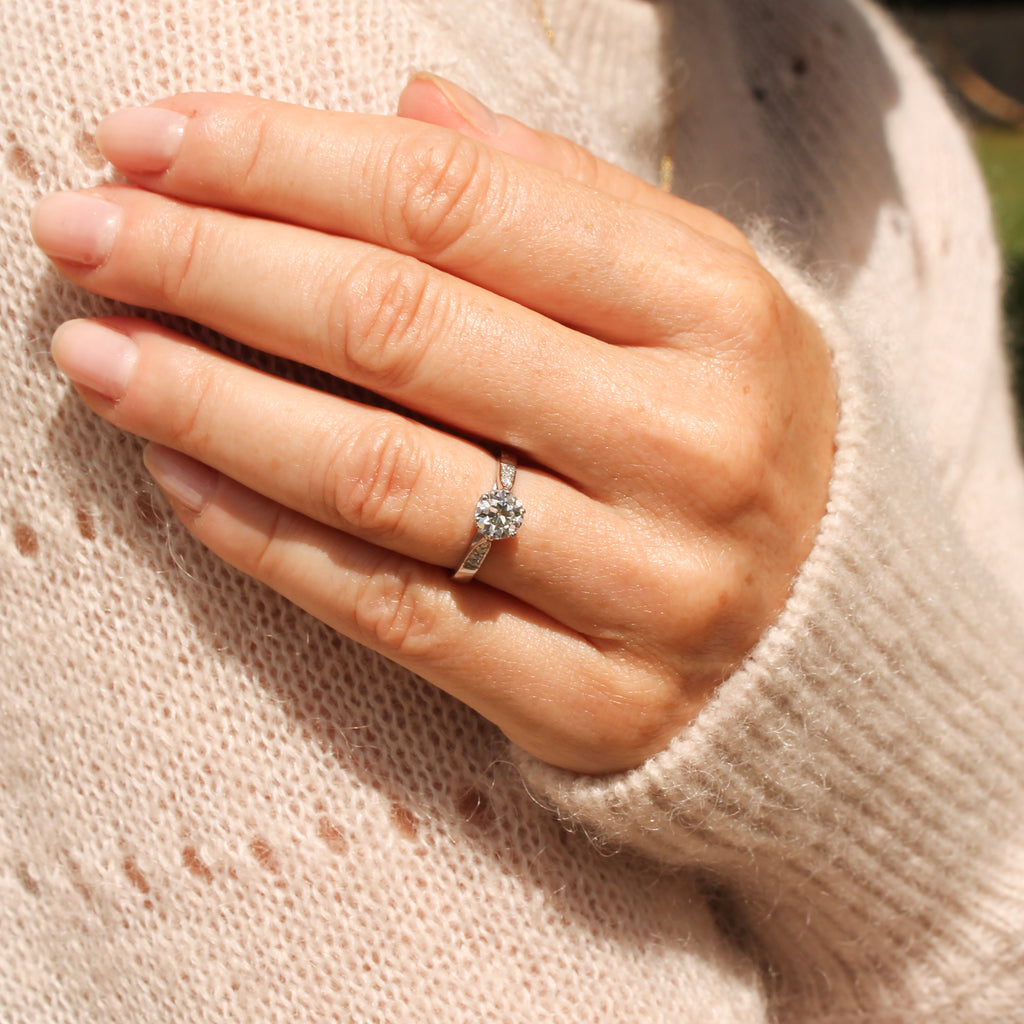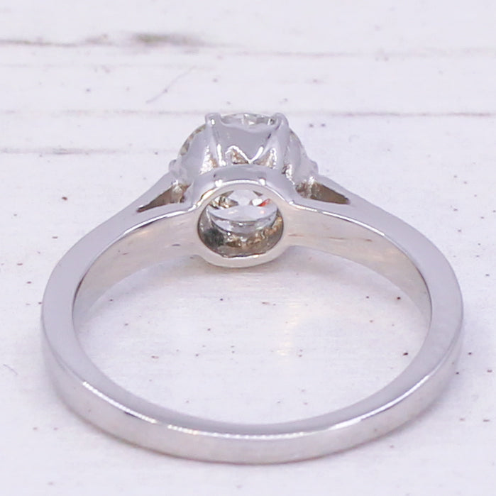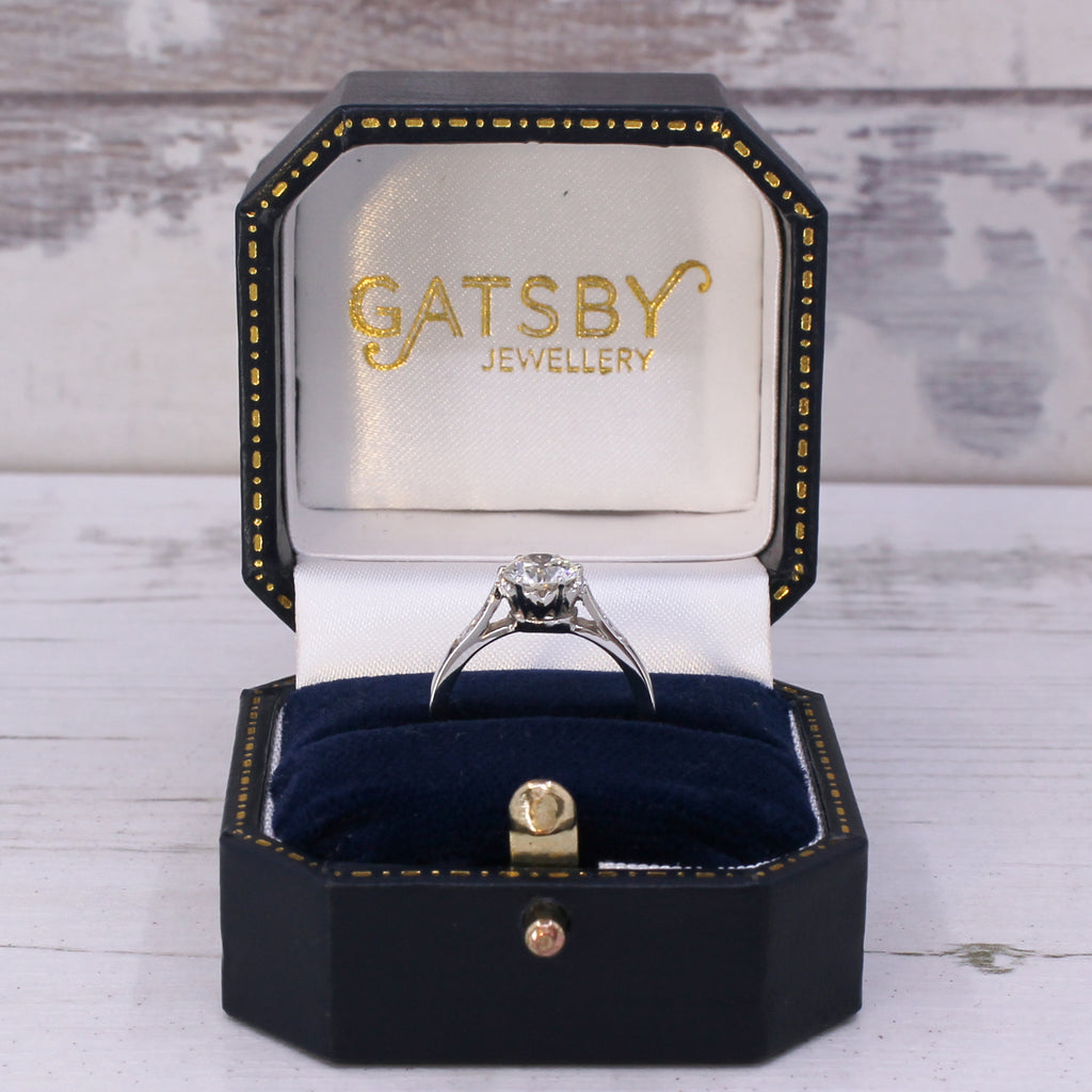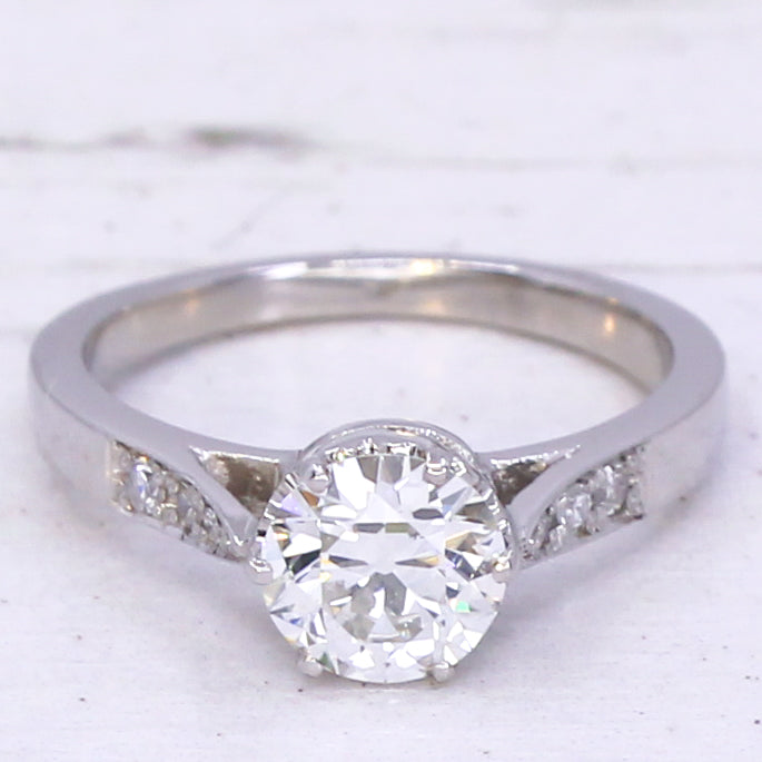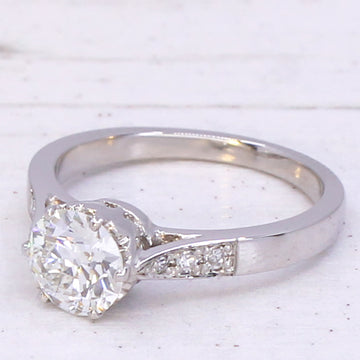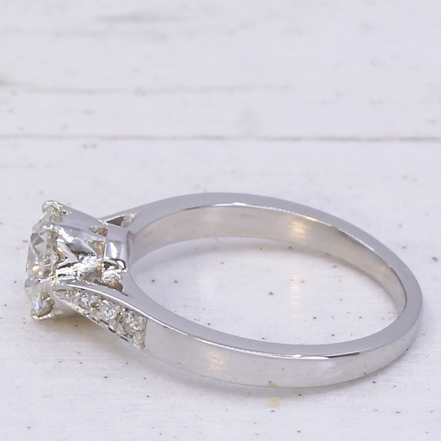 [message]A very classy, very beautiful Art Deco engagement ring. The old European cut diamond in the centre - graded by De Beers as J colour, VS1 clarity - is bright and full of fire. The stone is secured in a six claw platinum collet. The flat, tapering platinum shank features six (three each side) eight cut diamonds.
