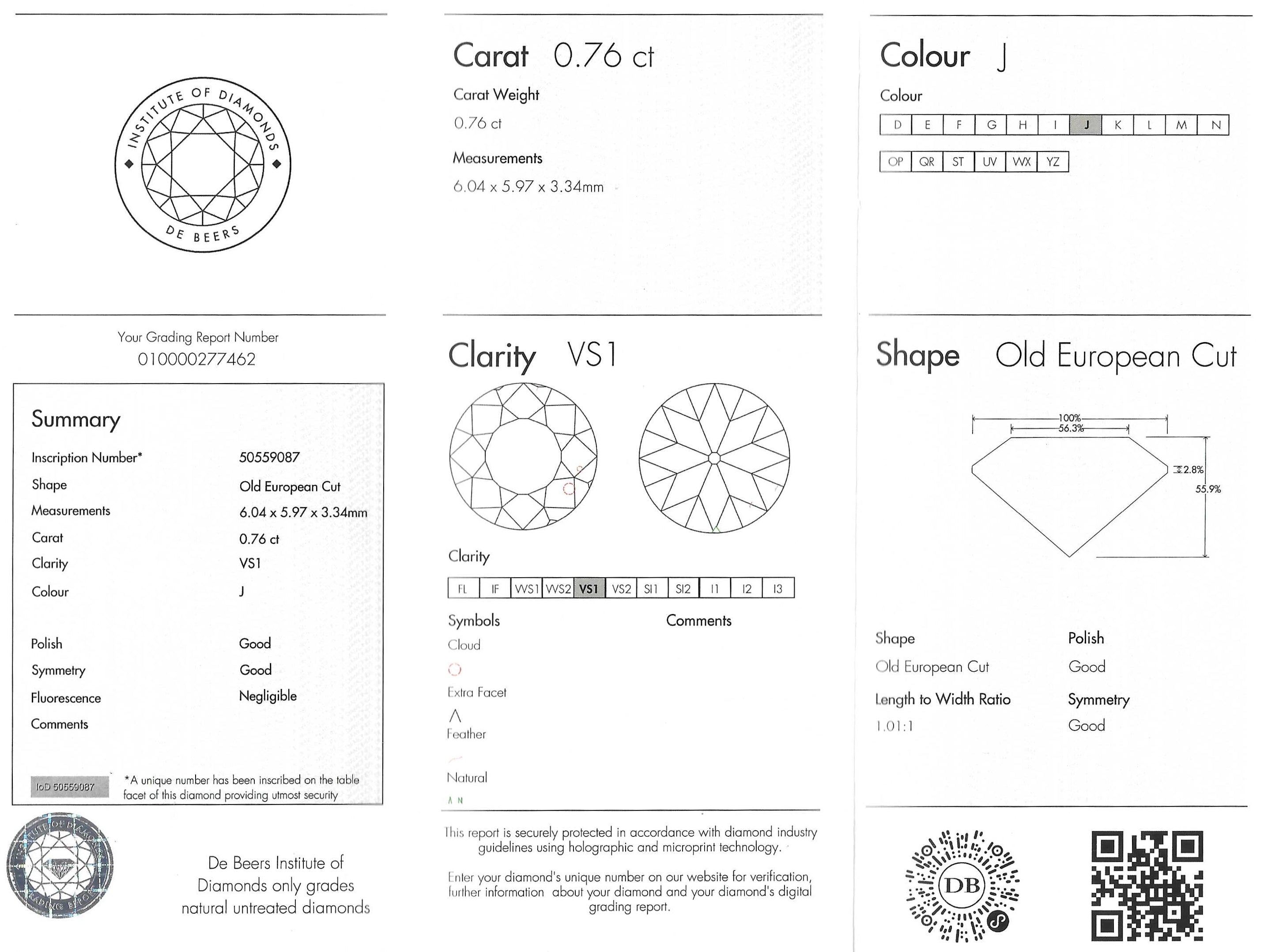 Accompanied by a De Beers Institute of Diamonds grading report. A unique number has been inscribed on this diamond providing utmost security.