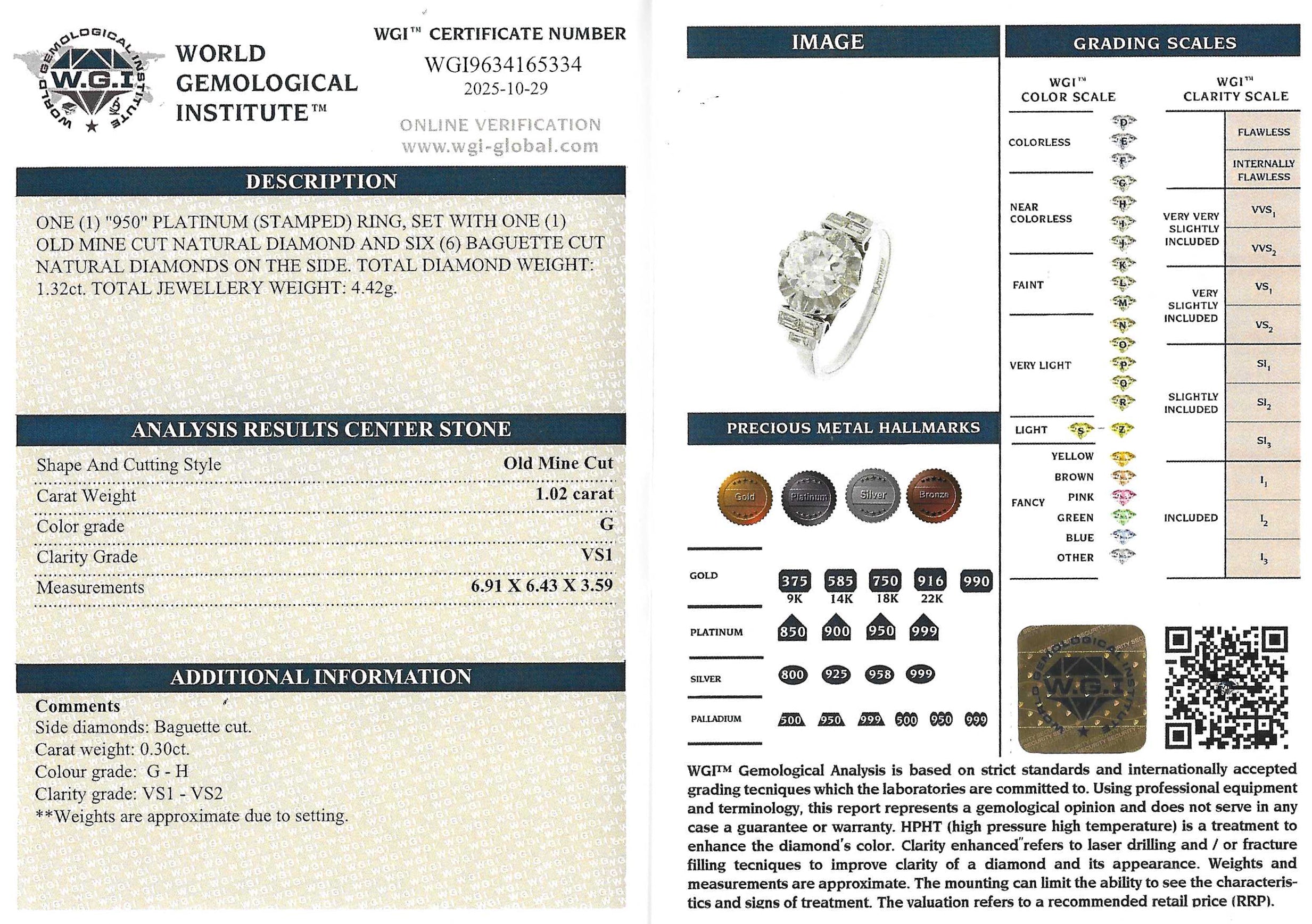 A very impressive vintage diamond engagement ring. The old mine cut diamond in the centre is incredibly white and internally clean. The stone is secured by six platinum claws with an open gallery and above a scalloped back plate, allowing maximum light into the diamond. Six (three each side) icy baguette cut diamonds are set in the shoulders, leading to a slim platinum shank.