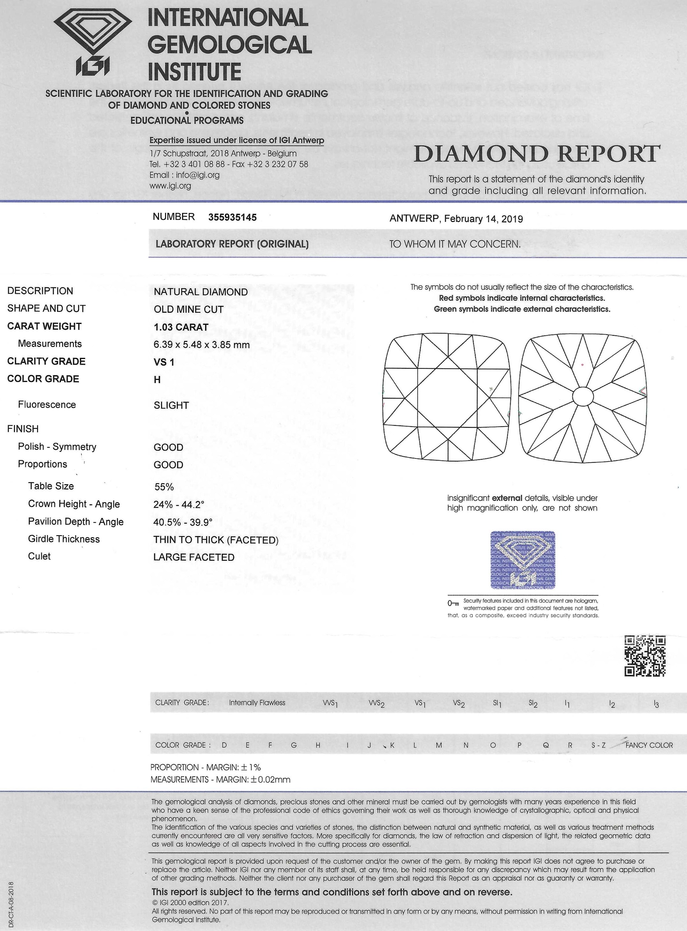 [message]Breathtaking. This wonderful vintage engagement ring features an old mine cut diamond of absolute top quality. Graded by IGI Antwerp as H colour, VS1 clarity, the cushion shaped stone is bursting with fire and brilliance. The stone is secured in a four claw platinum collet with inverted 'V' detailing in the gallery, leading to plain shoulders to a fluted 18k white gold shank.