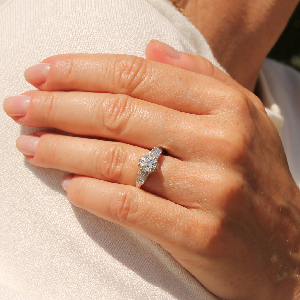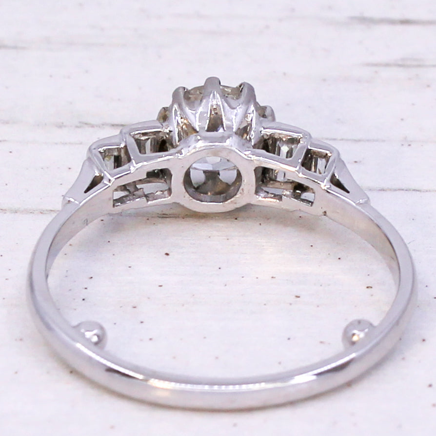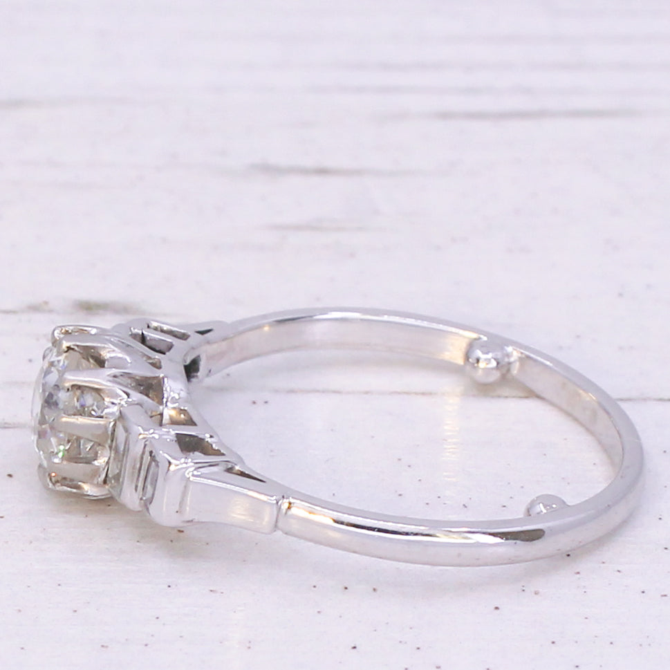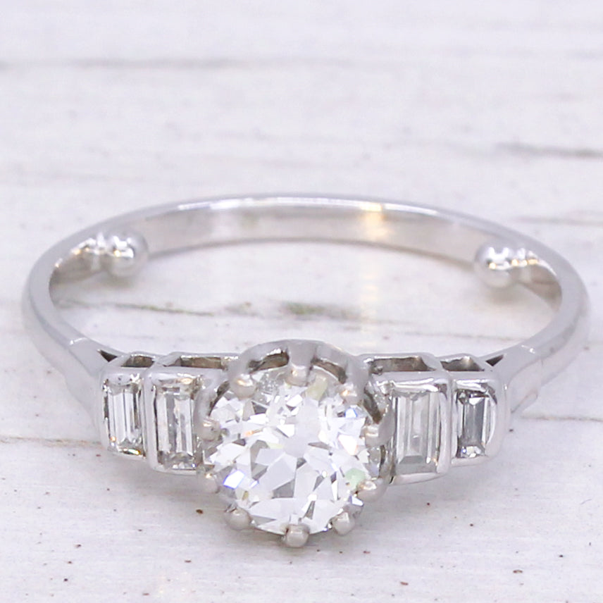 [message]A highly impressive Art Deco diamond engagement ring. The old European cut diamond in the centre - graded as high white (H) and internally clean (VS2) - is secured in a ten claw coronet collet and is flanked by step-down shoulders set with four (two either side) baguette cut diamonds to a slender platinum shank.