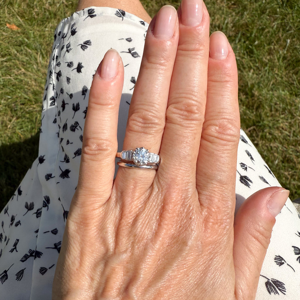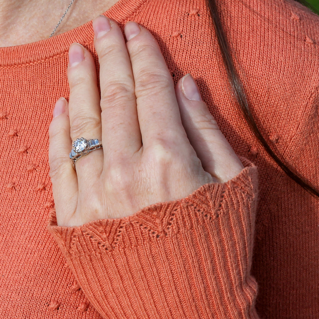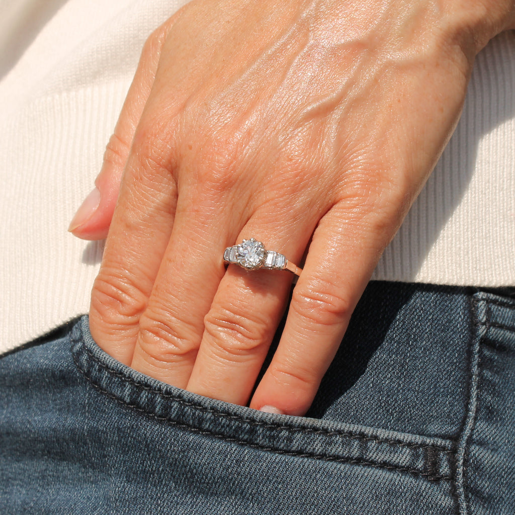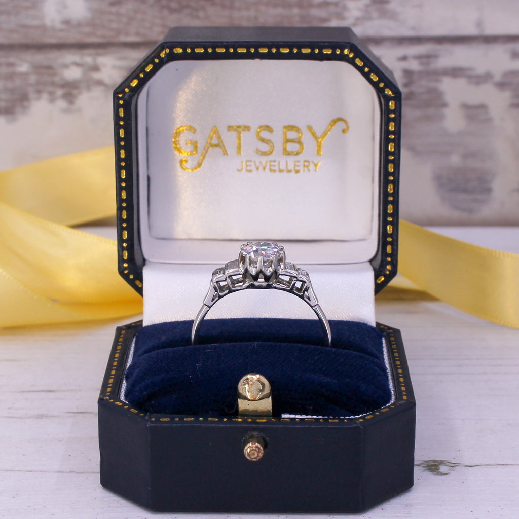 [message]A highly impressive Art Deco diamond engagement ring. The old European cut diamond in the centre - graded as high white (H) and internally clean (VS2) - is secured in a ten claw coronet collet and is flanked by step-down shoulders set with four (two either side) baguette cut diamonds to a slender platinum shank.
