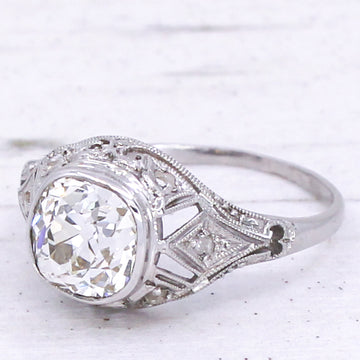 [message]A truly special antique diamond engagement ring. The cushion shaped old mine cut diamond in the centre is bright, internally clean and full of fire. The stone is rubover set in platinum, and crowns the most impressively detailed gallery; finely pierced and milgrained, and set with six small rose cut diamonds to a slim platinum shank. Gloriously crafted.