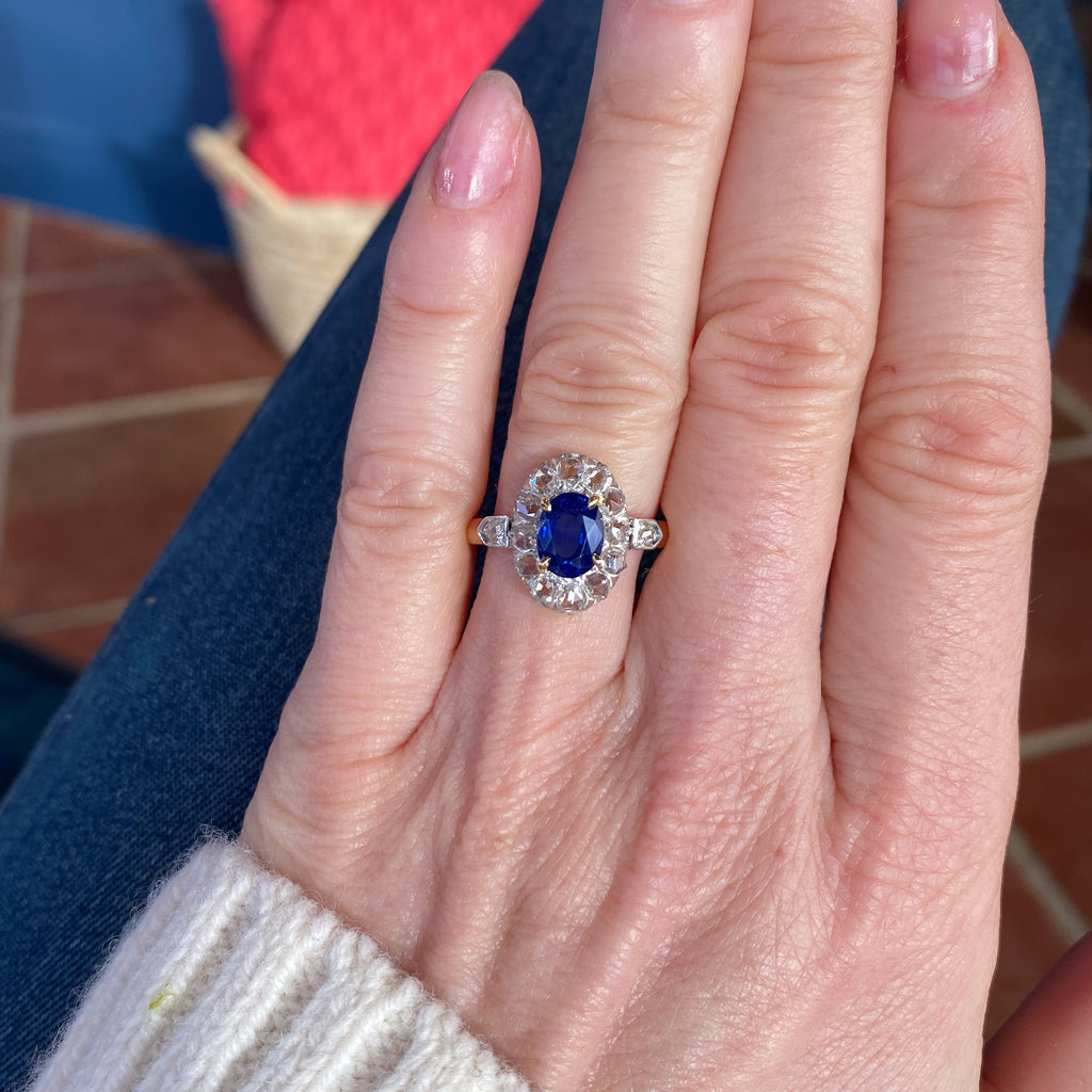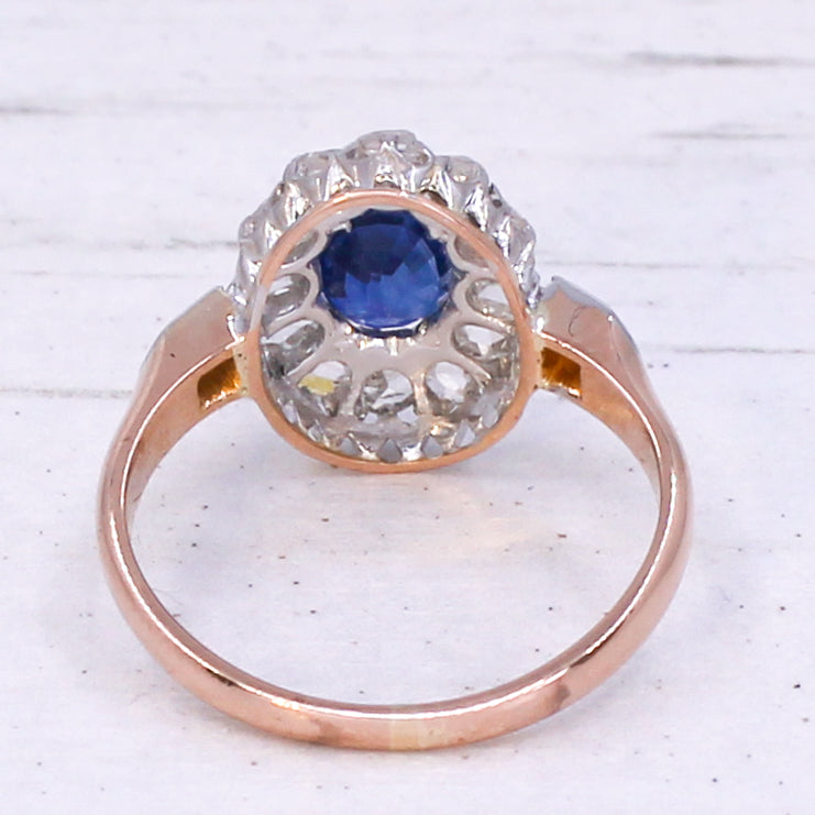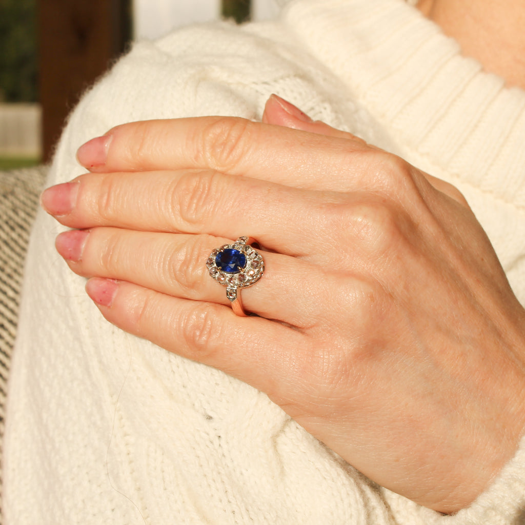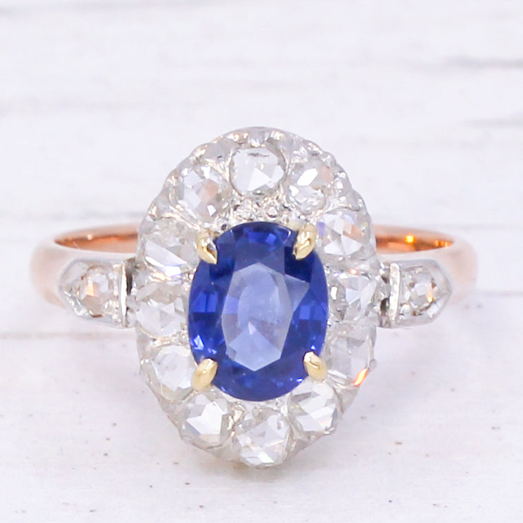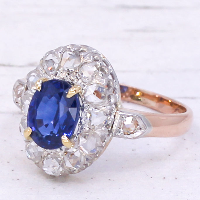 [message]An incredibly beautiful vintage sapphire ring. The sapphire in the centre - certified as Sri Lankan (Ceylon) - is a glowingly and vivid royal blue. The sapphire is surrounded by twelve rose cut diamonds in a platinum coronet cluster setting. The cluster sits within a slim, 18k rose gold shank with a further rose cut set in each shoulder.