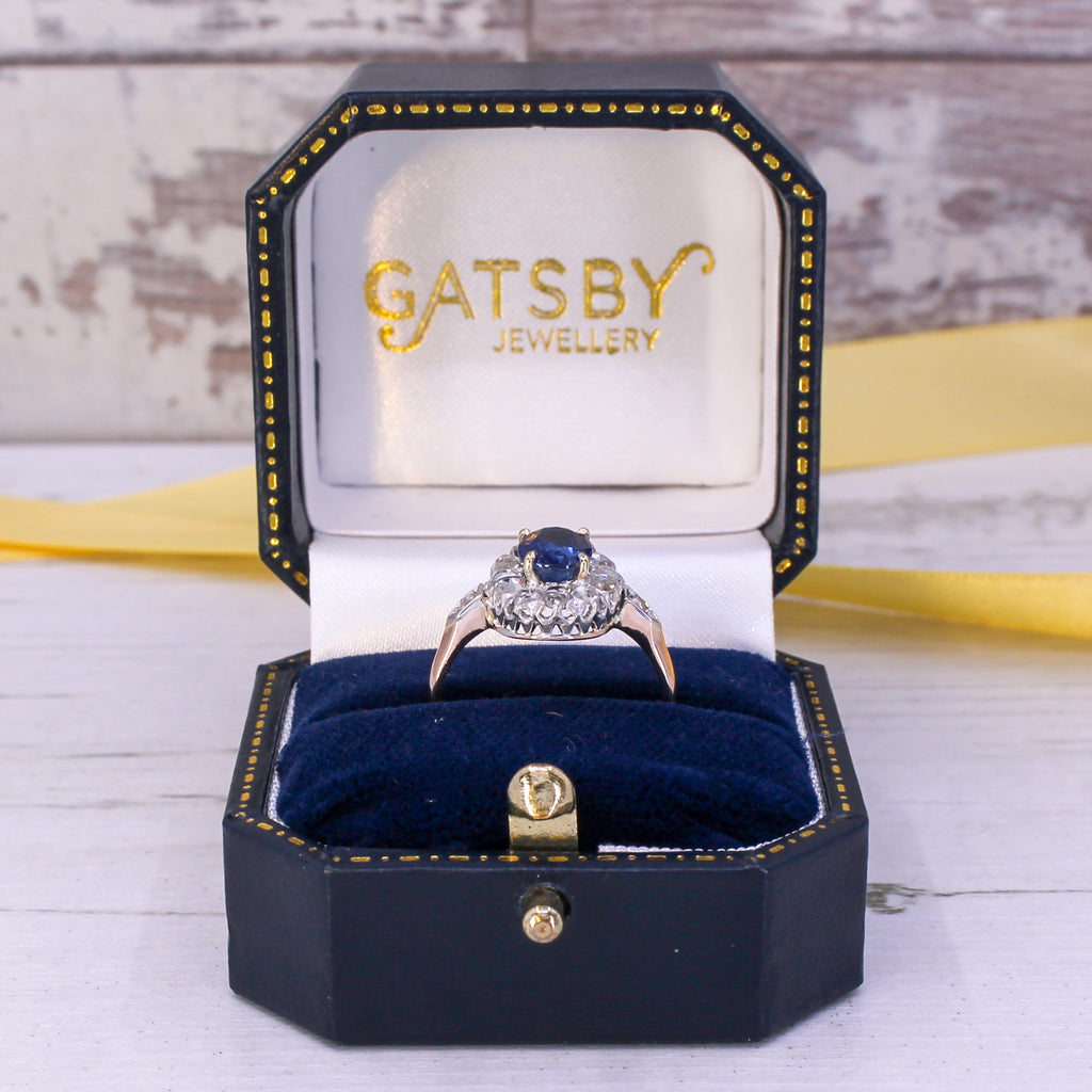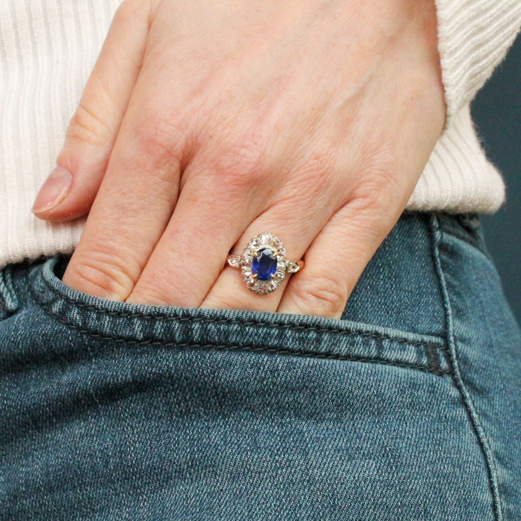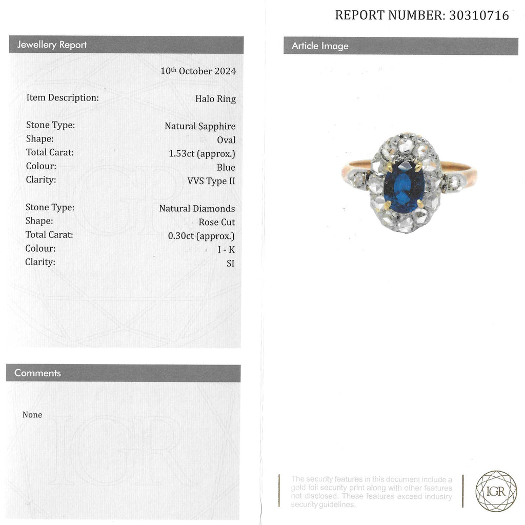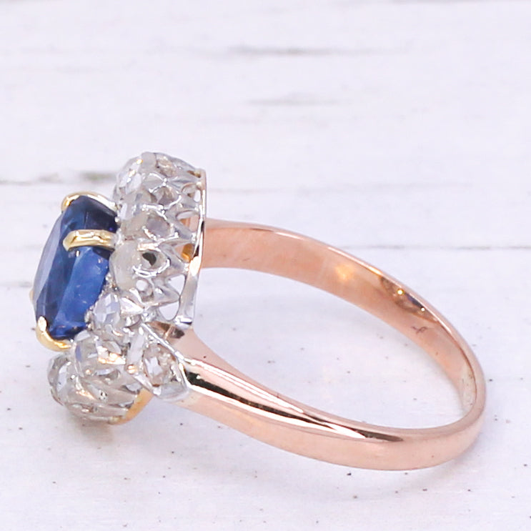 [message]An incredibly beautiful vintage sapphire ring. The sapphire in the centre - certified as Sri Lankan (Ceylon) - is a glowingly and vivid royal blue. The sapphire is surrounded by twelve rose cut diamonds in a platinum coronet cluster setting. The cluster sits within a slim, 18k rose gold shank with a further rose cut set in each shoulder.