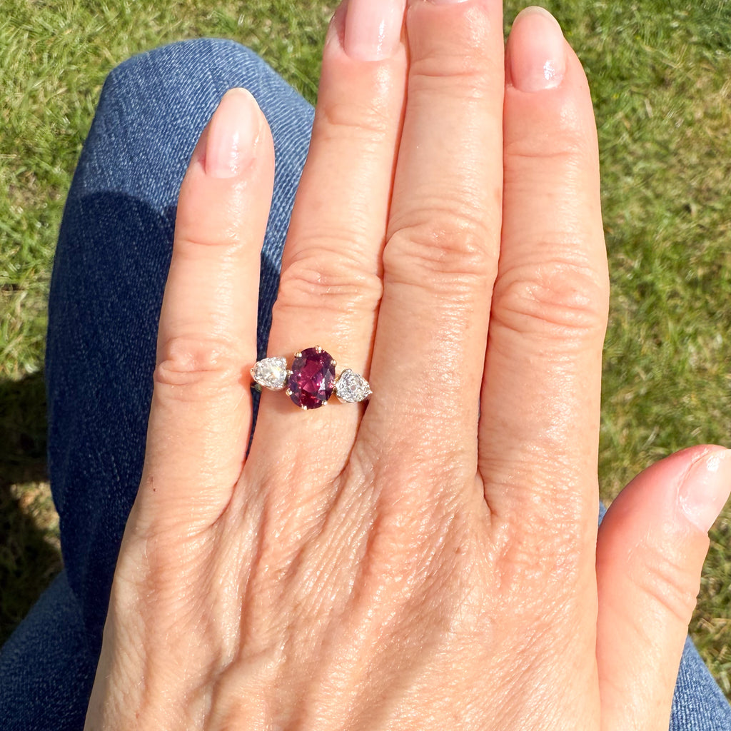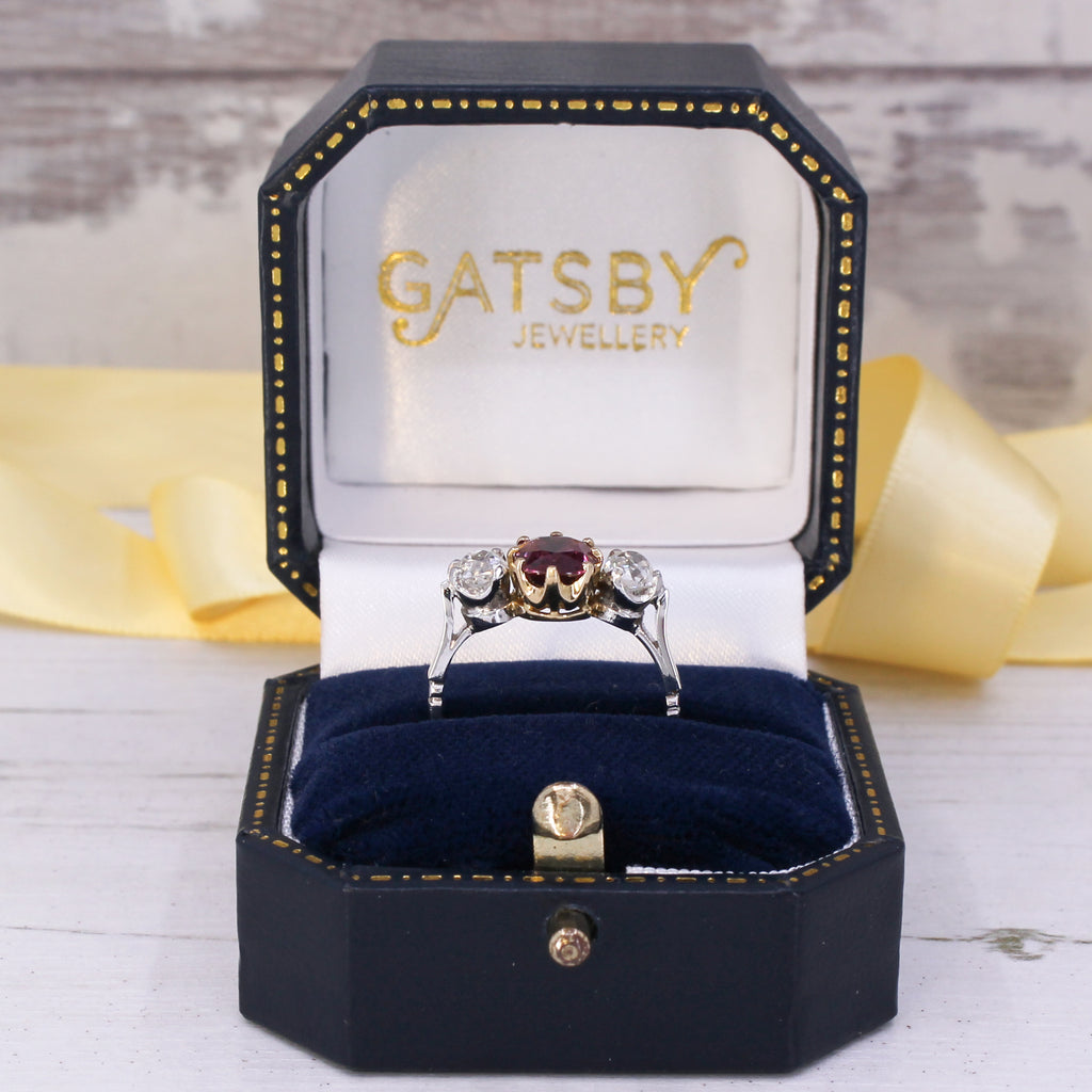 [message]A top grade vintage ruby and diamond three stone ring. The ruby in the centre - certified as natural and unheated - is a rich, carmine red with bright flashes of scarlet when light hits the stone. Secured in an eight-claw yellow gold coronet collet, the ruby is flanked by a pair of white and bright old mine cut diamonds set in platinum, leading to a slender platinum shank.