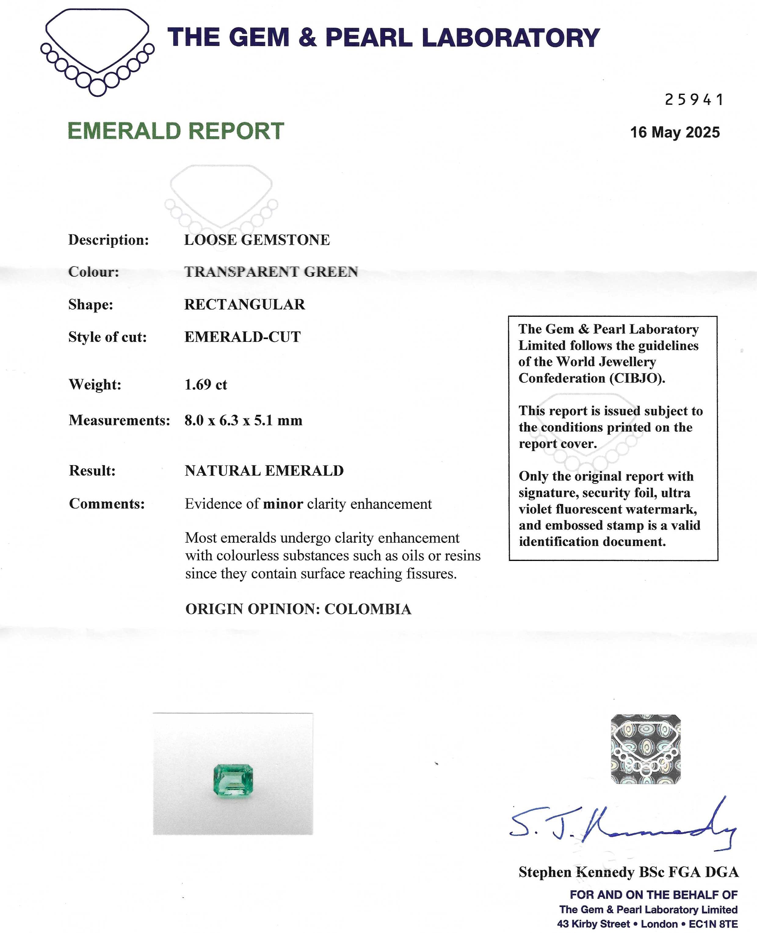 Accompanied by an emerald report from The Gem & Pearl Laboratory stating the emerald shows evidence of minor clarity enhancement, and is Colombian in origin.