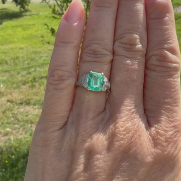 [message]An impressively beautiful vintage emerald ring. The square-ish emerald-cut emerald in the centre - certified as having received only minor clarity enhancement, or originating from Colombia - displays a bright and electric green. The stone is secured in a four-claw platinum collet with "V" shaped detailing in the gallery. The finely crafted shoulders are each set with five eight-cut diamonds and a laterally set baguette cut diamond, leading to a slim, platinum shank.