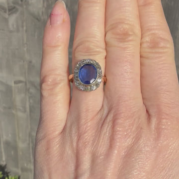 [message]A breathtaking antique sapphire ring. The oval shaped sapphire - certified as natural, unheated and originating from Ceylon (Sri Lanka) - displays a rich and deep blue. The stone is rubover set in 18k yellow gold and surrounded by 19 old mine cut diamonds set in silver, sitting atop a slender tapering shank which displays a very slightly rose coloured gold.