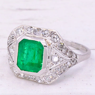[message]A truly beautiful Art Deco emerald ring. The emerald-cut emerald in the centre - certified by GRS, Switzerland as having received only minor oil treatment - displays a stunningly bright and vivid green. The stone is rubover set in platinum and surrounded by 28 eight-cut diamonds in a finely pierced and milgrained gallery.