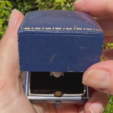 An impressive Art Deco opal ring. The elongated oval shaped opal in the centre has a clear white base colour and displays a lively play of oranges and greens. The stone is set within a milgrained rubover setting and is flanked by two pairs of eight cut diamonds in milgrained box settings. The geometric detailing at each "corner" of opal provides this classy piece with distinct Art Deco flair.