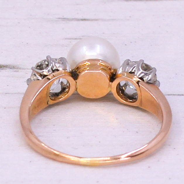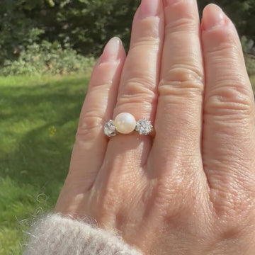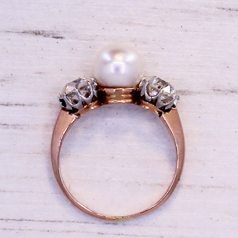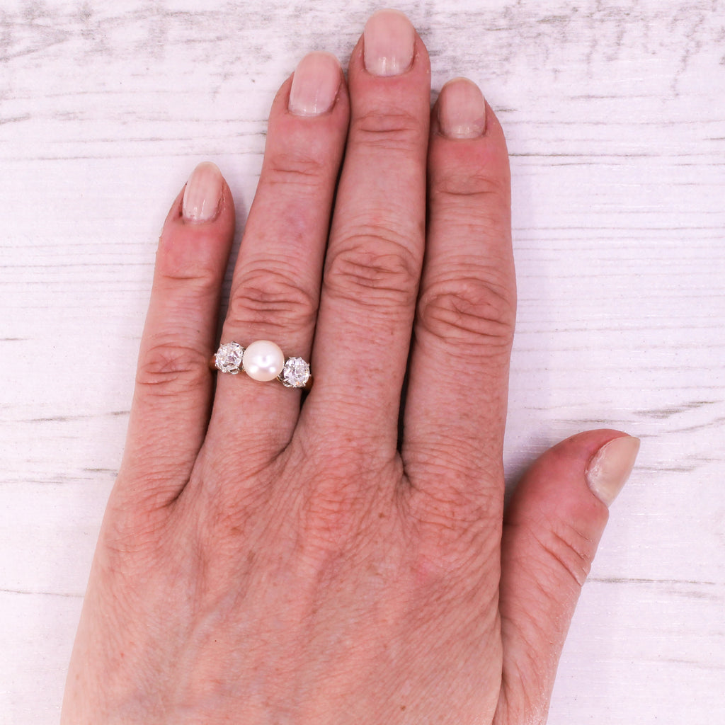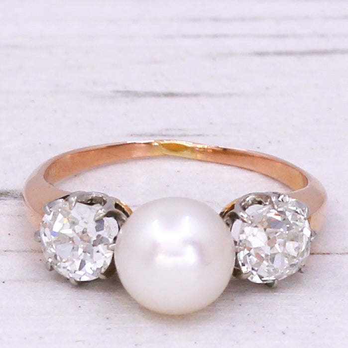 [message]A fine Art Deco pearl and old cut diamond three stone ring. The white, highly lustrous pearl is flanked by a pair of high white, bright and internally clean natural diamonds. The diamonds are secured in platinum coronet collet. Sits on a slim and tapering rose gold shank.