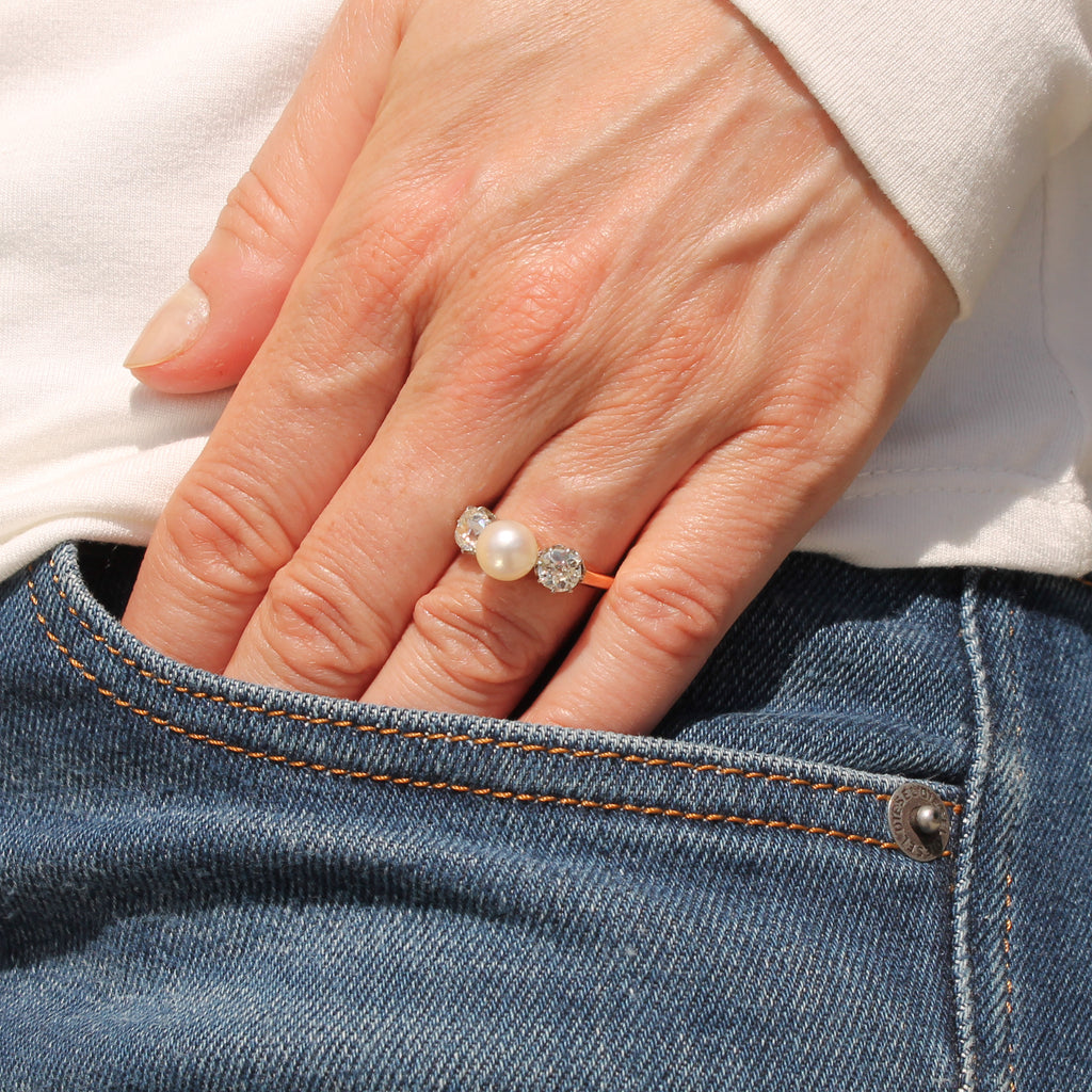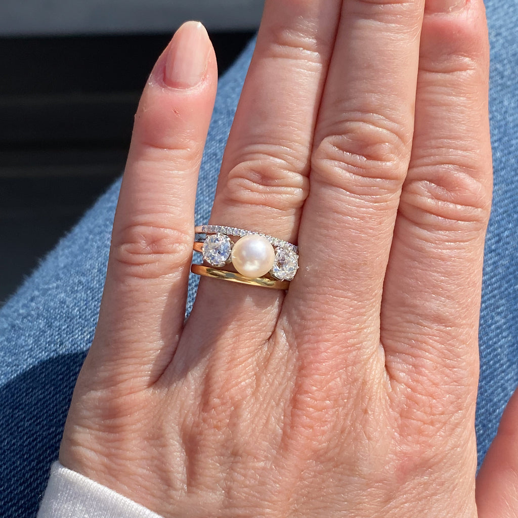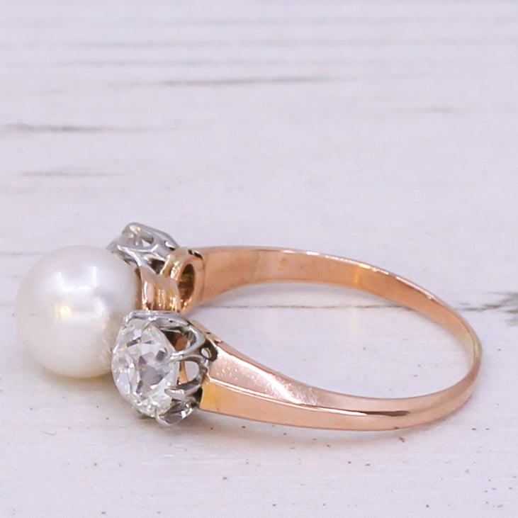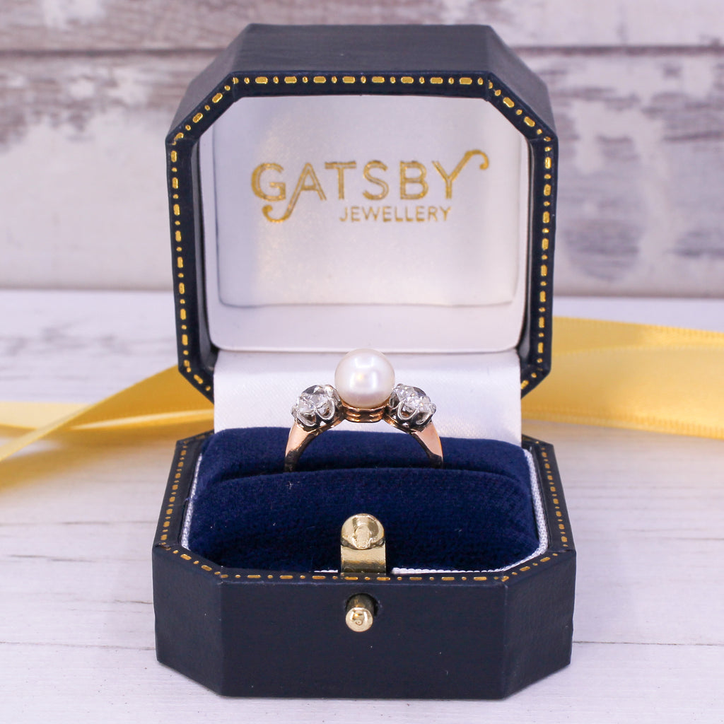 [message]A fine Art Deco pearl and old cut diamond three stone ring. The white, highly lustrous pearl is flanked by a pair of high white, bright and internally clean natural diamonds. The diamonds are secured in platinum coronet collet. Sits on a slim and tapering rose gold shank.