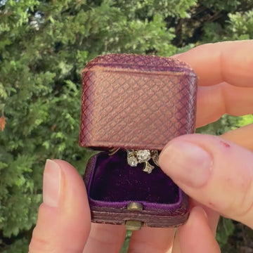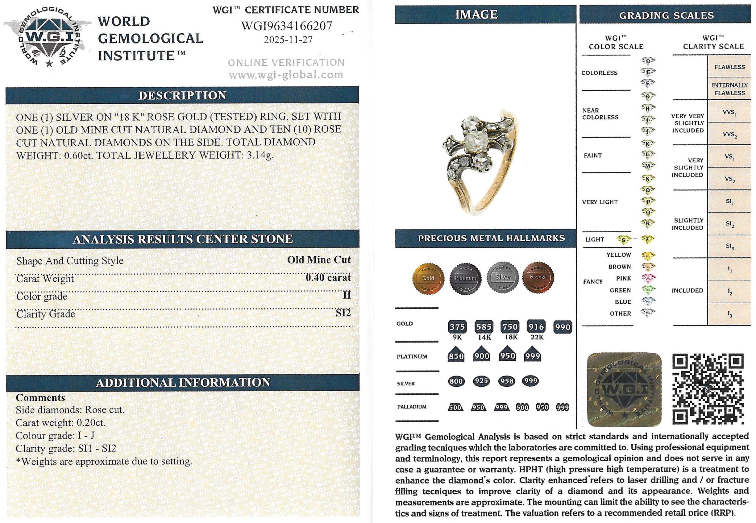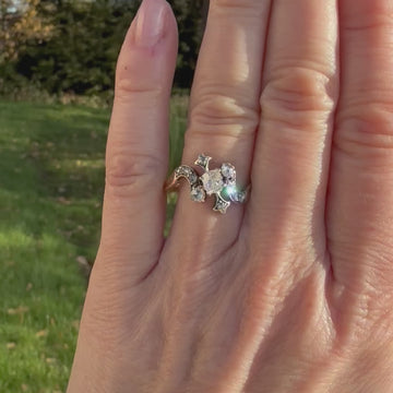 [message]A distinctive and ornate antique diamond ring. The cushion shaped old mine cut diamond in the centre is glowingly white and bright. Two trefoil spurs set with rose cut diamonds flank two sides of the centre stone, with a pair of slightly larger rose cuts set immediately next to the other sides of the centre diamond. A sweeping, rose cut set band is topped in silver, leading a curved, fluted 18k rose gold shank.