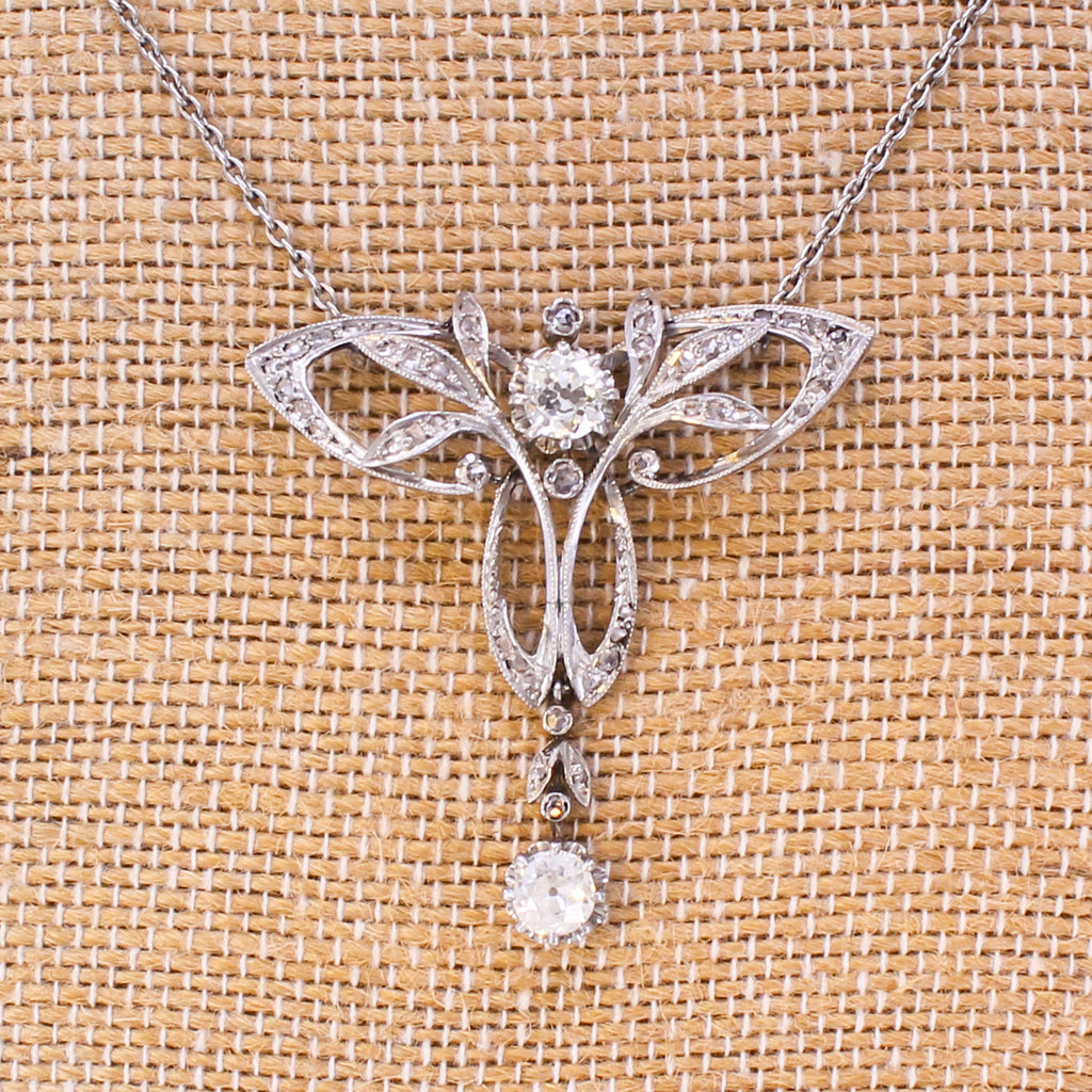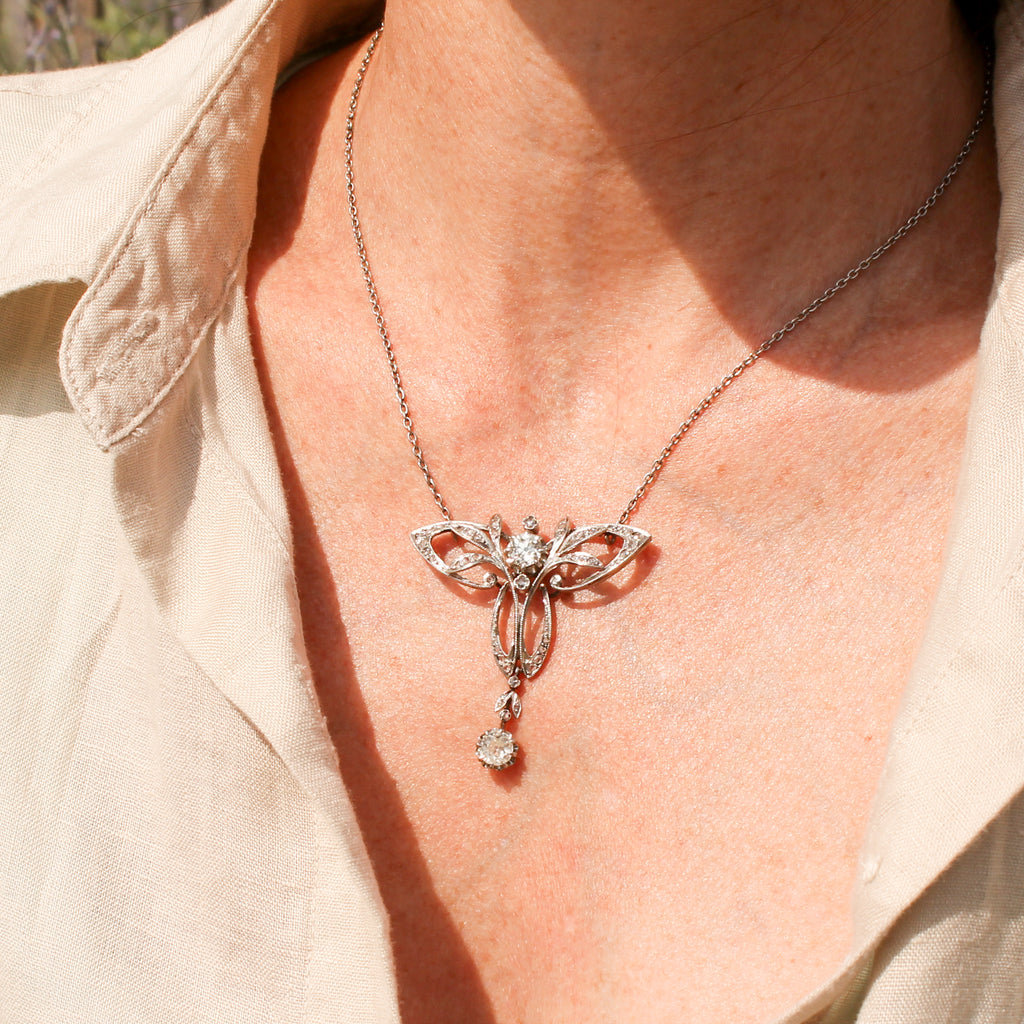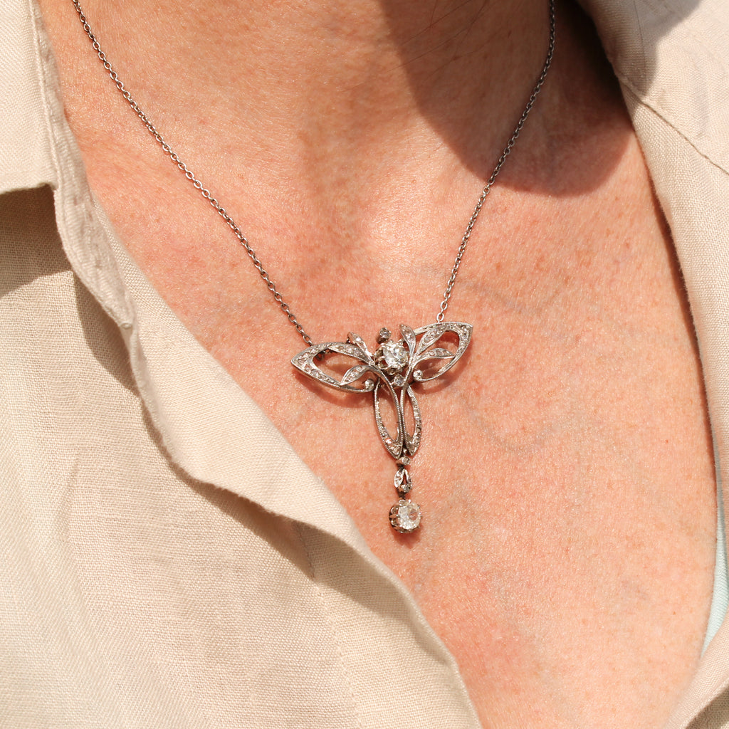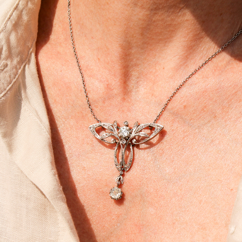 An arresting and beautiful Art Nouveau diamond pendant. The design features a stylised butterfly motif set with 48 rose cut diamonds. At the centre is a bright and lively old European cut diamond of approximately 0.70 carat, while a further diamond (also approx. 0.70 carat) drops at the bottom to complete the pedant's silhouette.