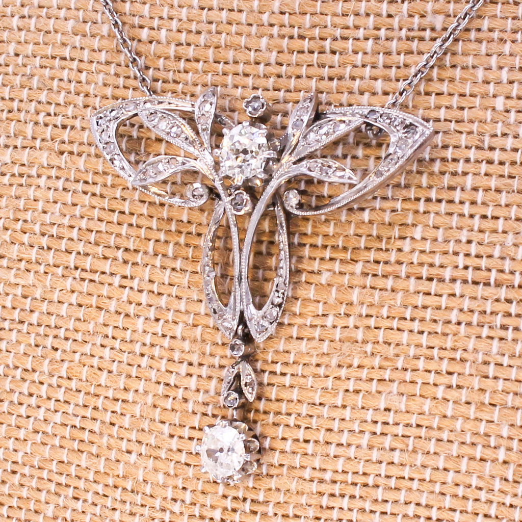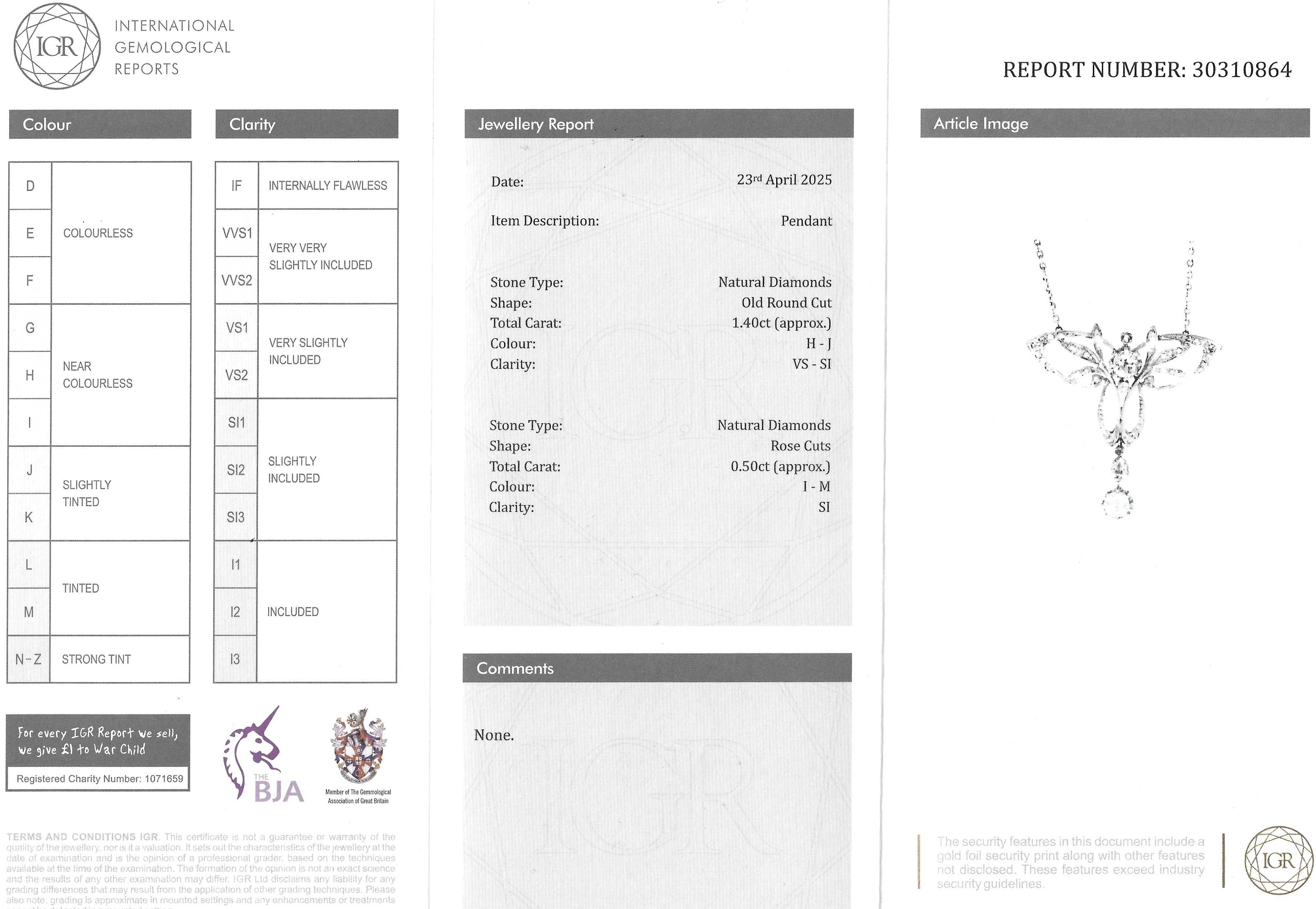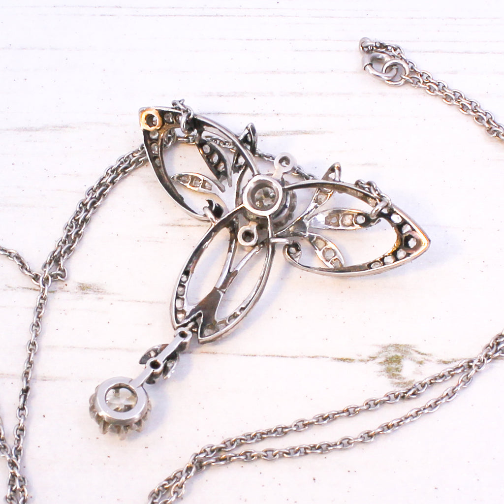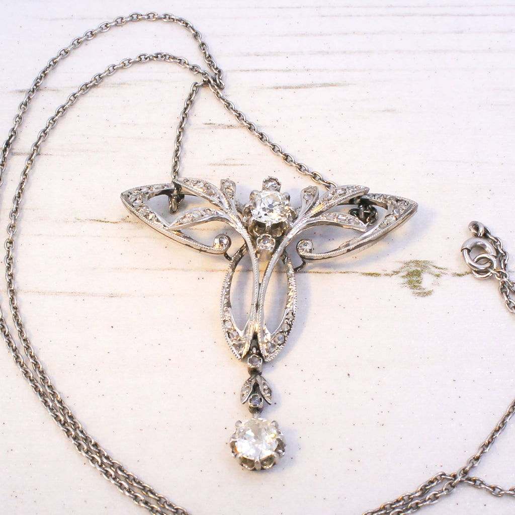 An arresting and beautiful Art Nouveau diamond pendant. The design features a stylised butterfly motif set with 48 rose cut diamonds. At the centre is a bright and lively old European cut diamond of approximately 0.70 carat, while a further diamond (also approx. 0.70 carat) drops at the bottom to complete the pedant's silhouette.