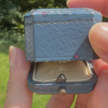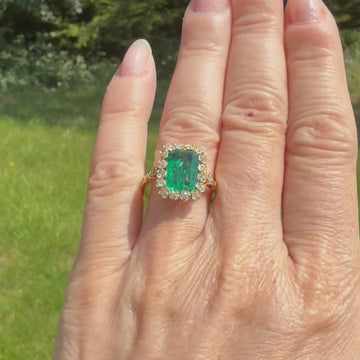 A mesmeric antique emerald ring. The emerald cut emerald in the centre - certified as Colombian - displays a bright, grassy green. Although there are inclusions in the emerald (which is common), the stone remain bright and vivid. Sixteen old mine cut diamonds surround the centre stone, each in an individual rubover setting, with a further two diamonds nestled in the split shoulders. The unusual vented back-hole features decorative hand-engraving - the sort of detail one would only ever find in an antique piece. On a fluted, slim 18k gold shank.