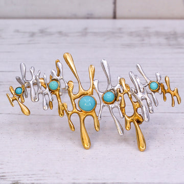 A beautiful brooch by Charles de Temple, one of the most innovative and influential jewellery designers of the 1960s and 70s. This magnificent abstract piece is crafted in 18k white and yellow gold, and punctuated by five round turquoise stones of varying size.