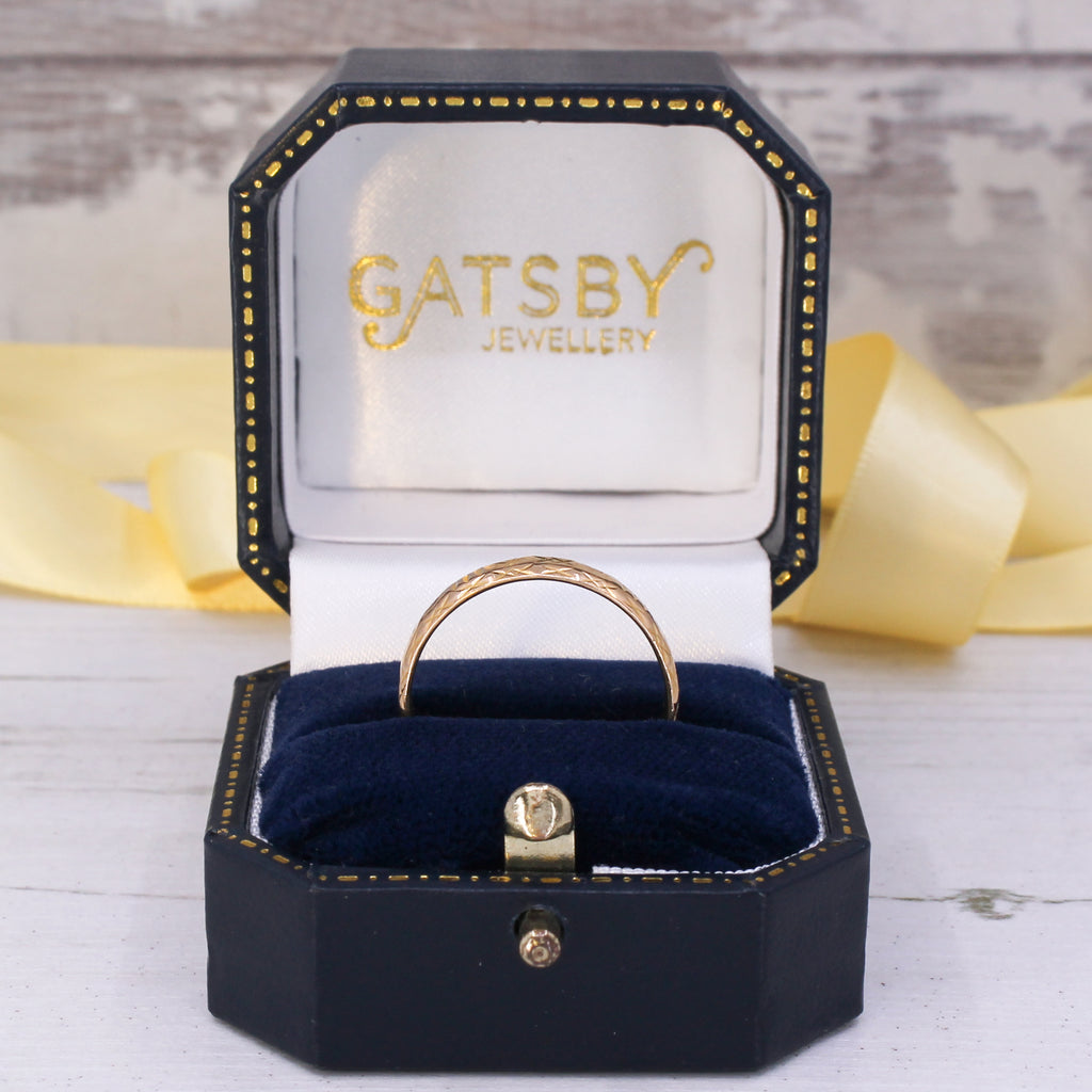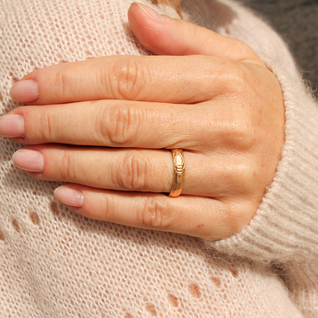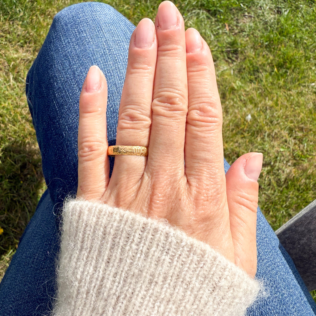 [message]A D-shaped band with ornate hand engraving which travels around the entire band. The internal characters state that this ring is crafted in 'central' or 'middle' gold, which refers to a purity of 22k.