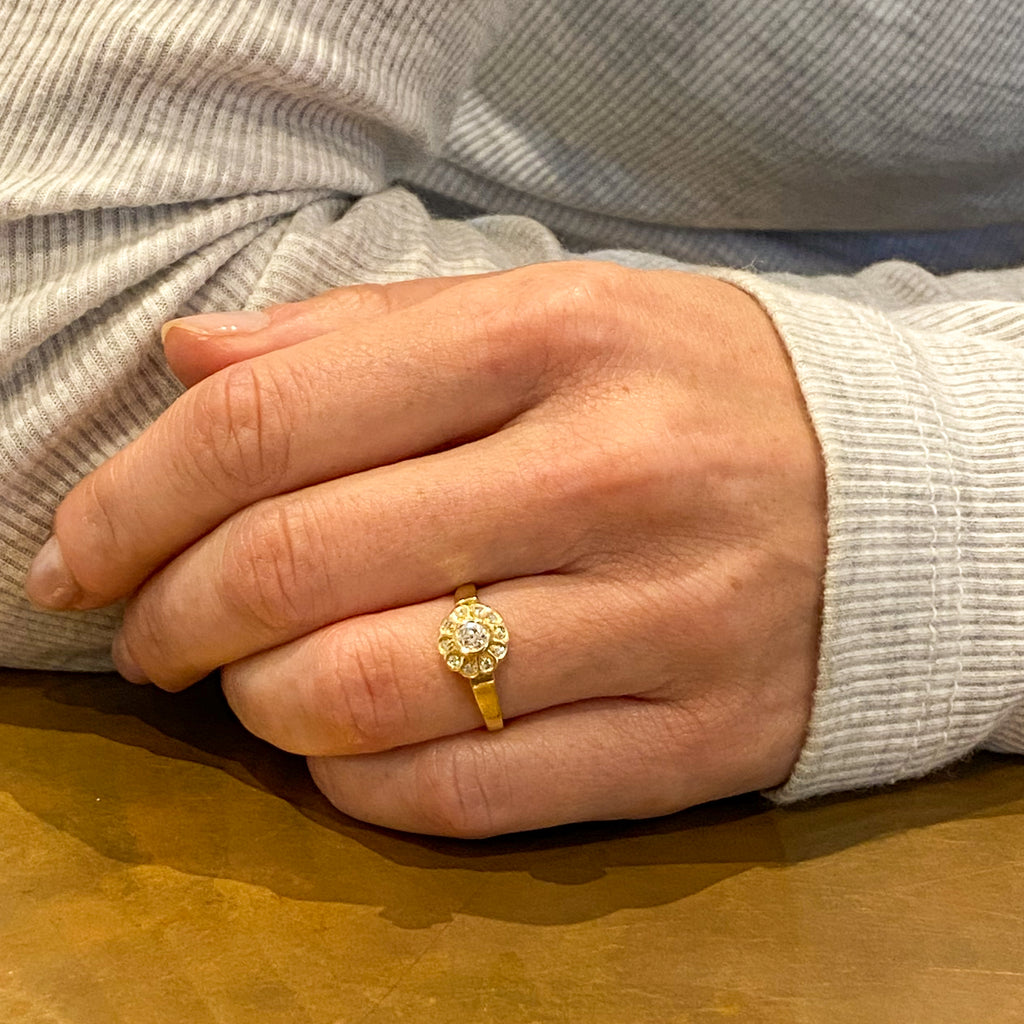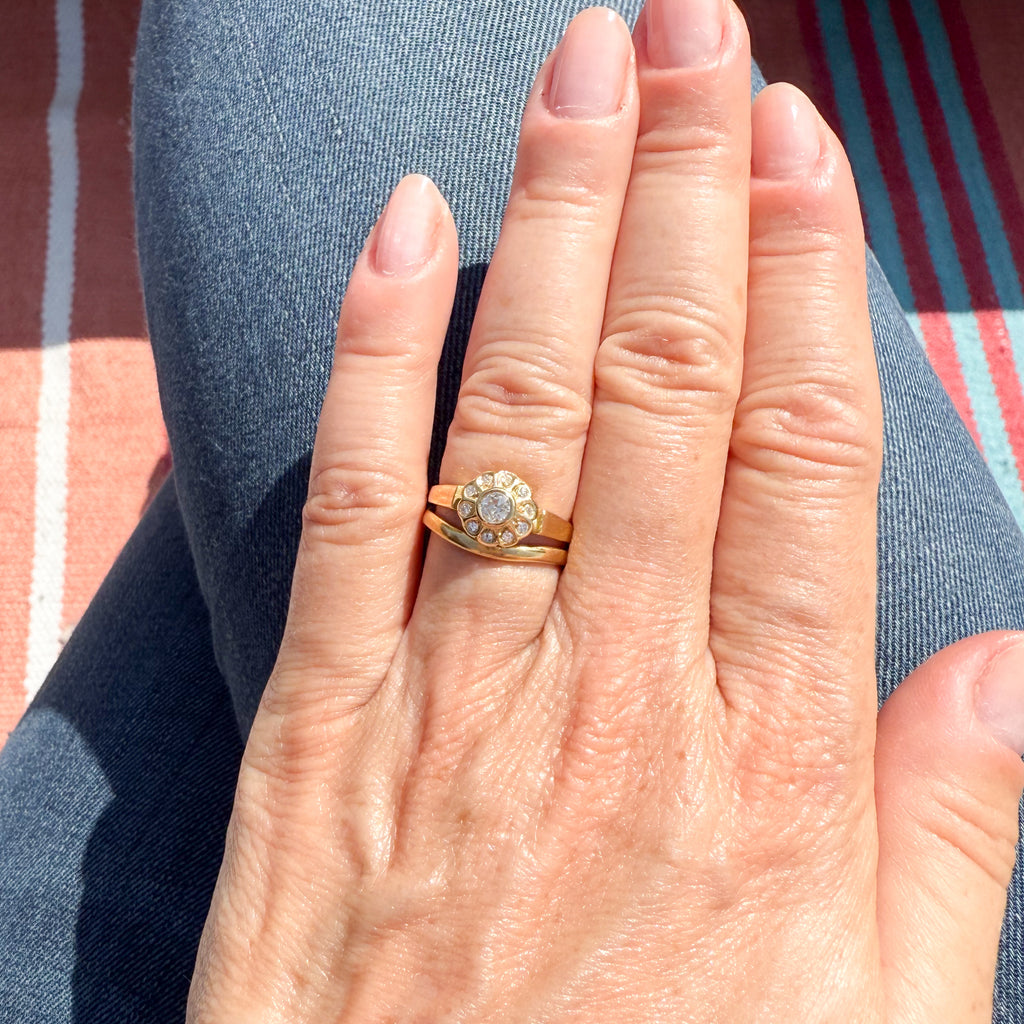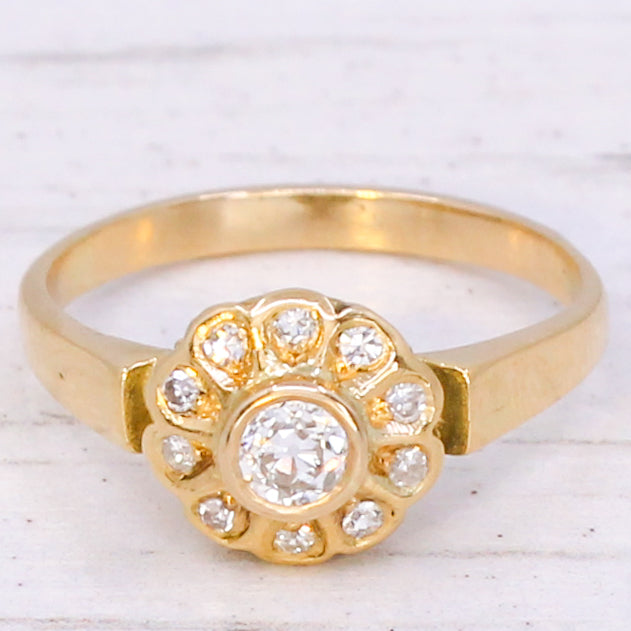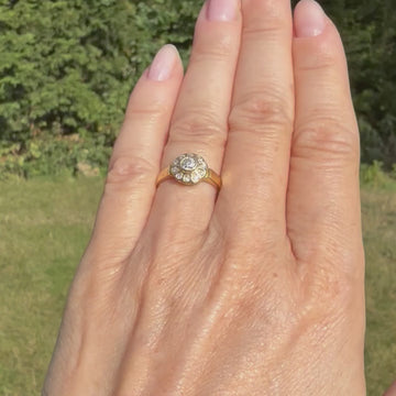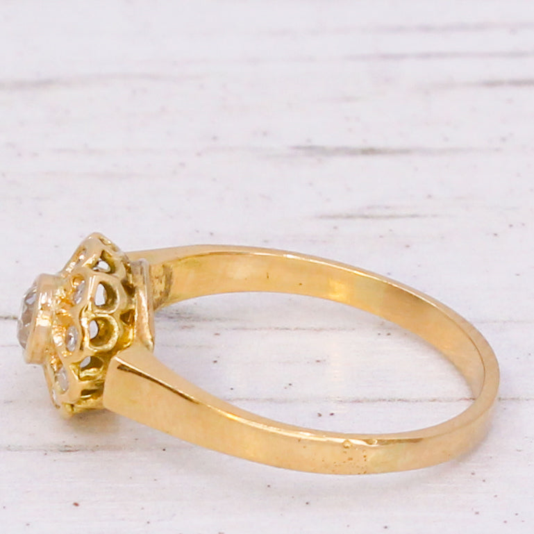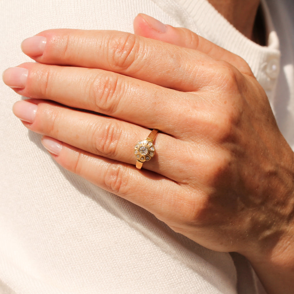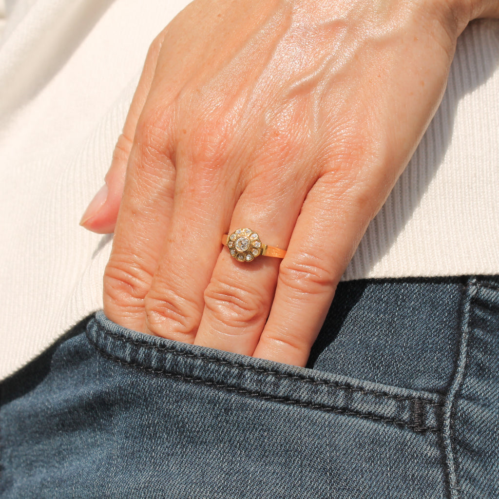 [message]So, so pretty. This gorgeous Edwardian diamond cluster ring is realised in a 18k yellow gold, with a super white and bright old European cut diamond in the centre. Ten small eight-cut diamonds are rubover set in the surround. The finely pierced gallery leads to a substantial flat shank.
