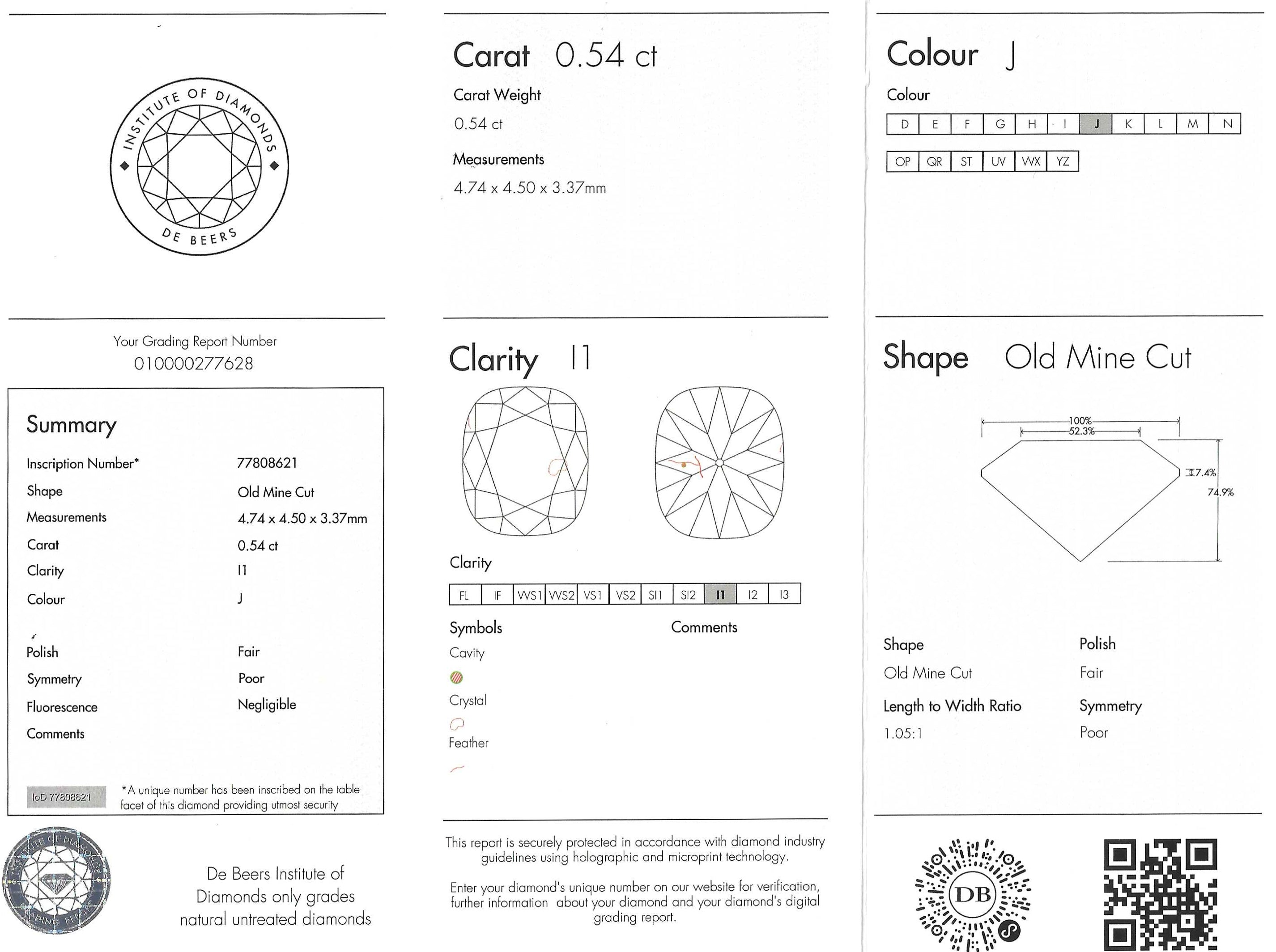 Accompanied by a De Beers Institute of Diamonds grading report. A unique number has been inscribed on this diamond providing utmost security.