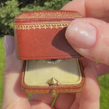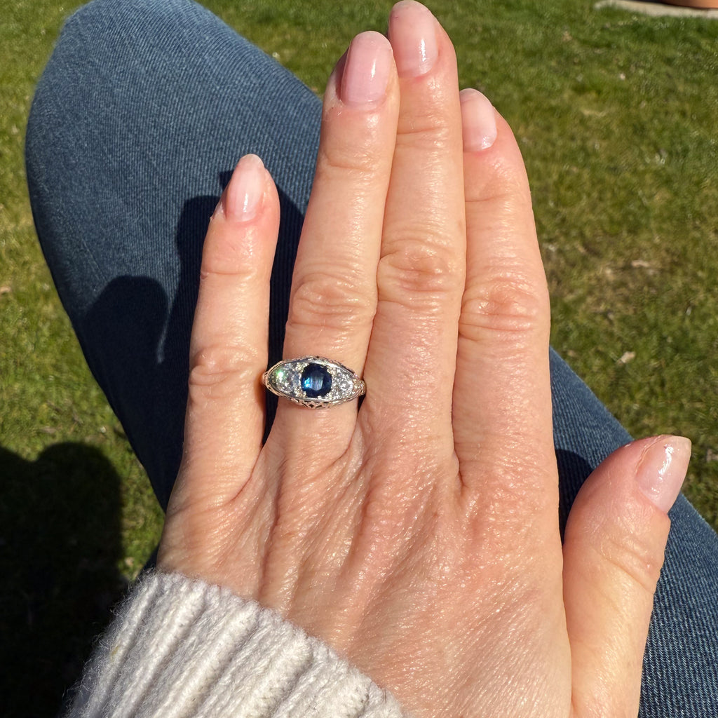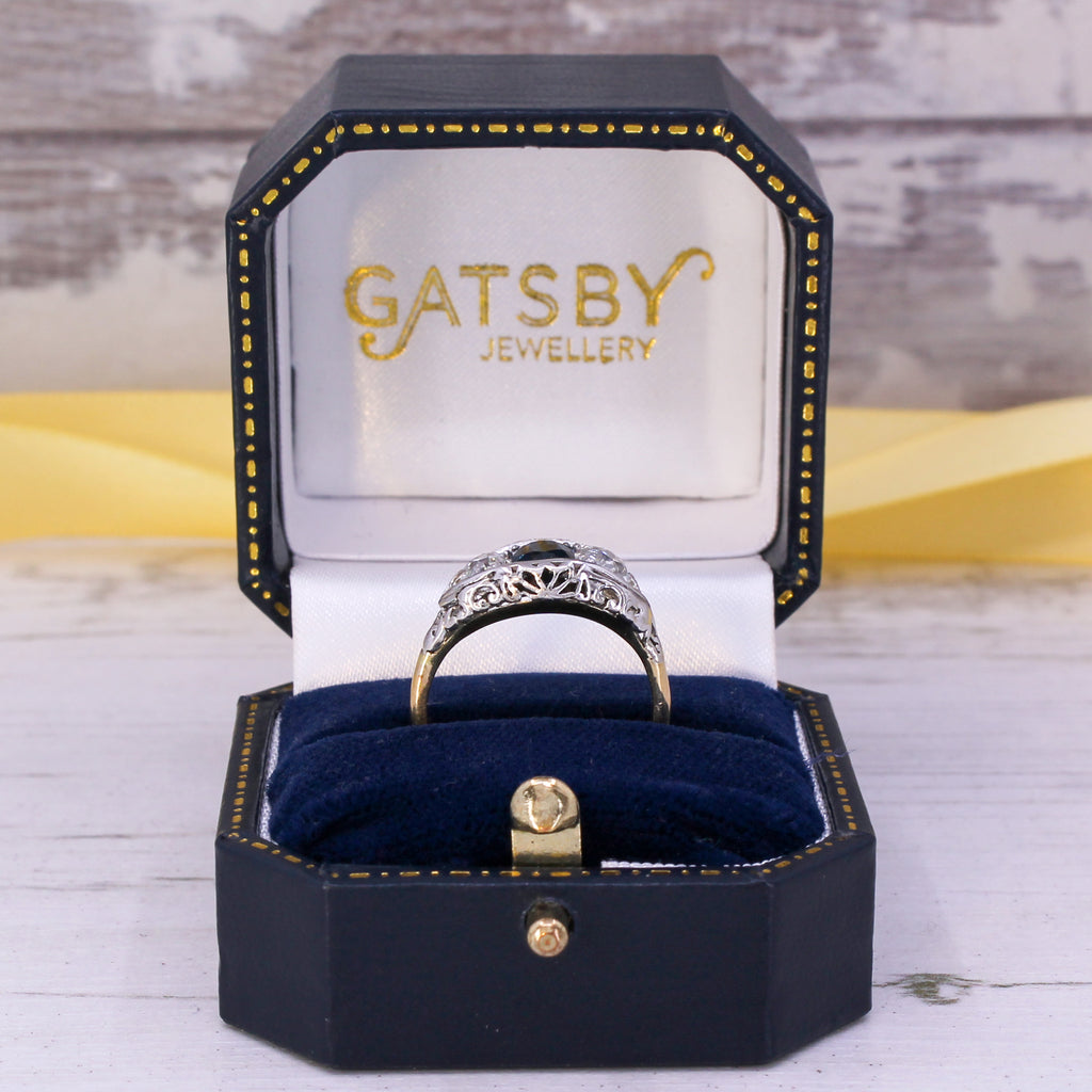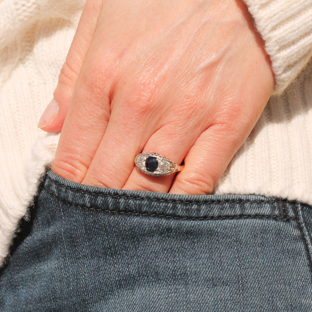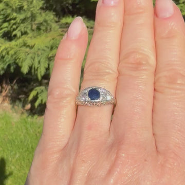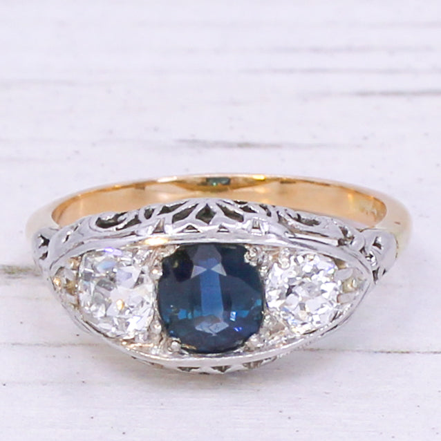 [message]An antique sapphire and old cut diamond trilogy ring of rare class and beauty. The deep blue sapphire in the centre is flanked by a pair of high white and bright old cut diamonds, set in platinum. Stunning and intricate filigree detailing in the gallery leads to a slim D-shaped yellow gold shank.