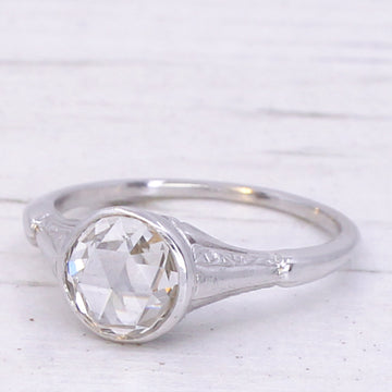 A wonderfully fresh and bright rose cut diamond ring. The centre stone - weighing a known 1.00 carat exactly - is high white and internally clean. The stone is rubover set in fine platinum setting featuring a finely pierced gallery and ornate engraving down the sides of the shoulders. On a slim, platinum shank.