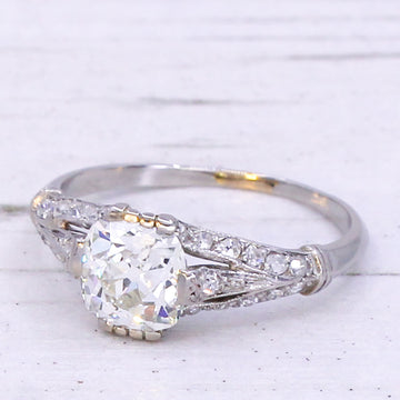 [message]This is truly a work of art. A top class Edwardian engagement ring featuring a glowingly white, internally clean, and very lively old mine cut diamond within a fabulously crafted setting. The centre stone sits within, and is secured by, tri-split shoulders, set with a total of 26 old cut and eight-cut diamonds which leads to a slender, knife-edge platinum shank. Utterly, utterly wonderful.