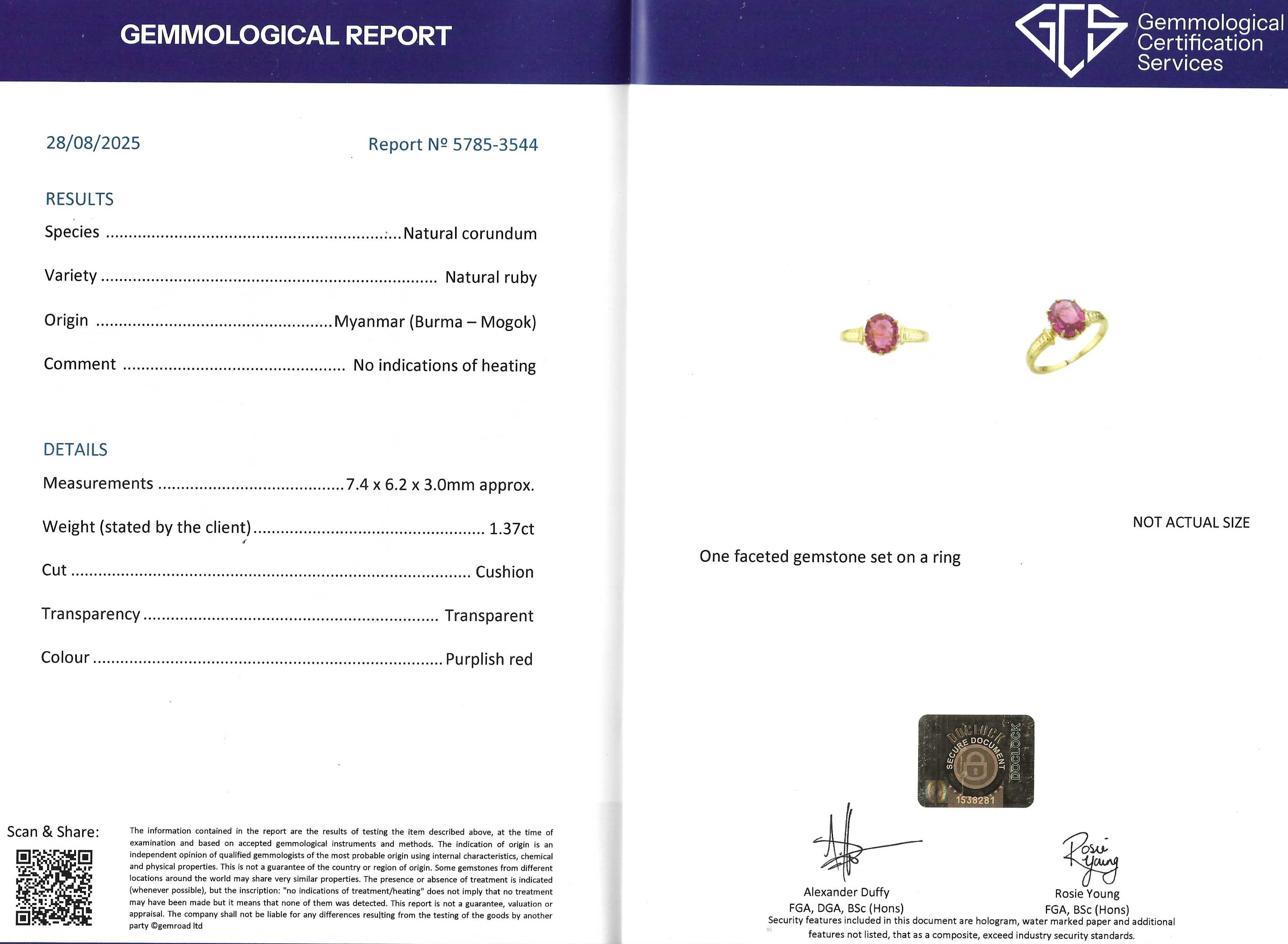 Accompanied by a report from Gemmological Certification Services (GCS) stating the ruby shows no indications of heating, and is Burmese (Myanmar) in origin, from Mogok.