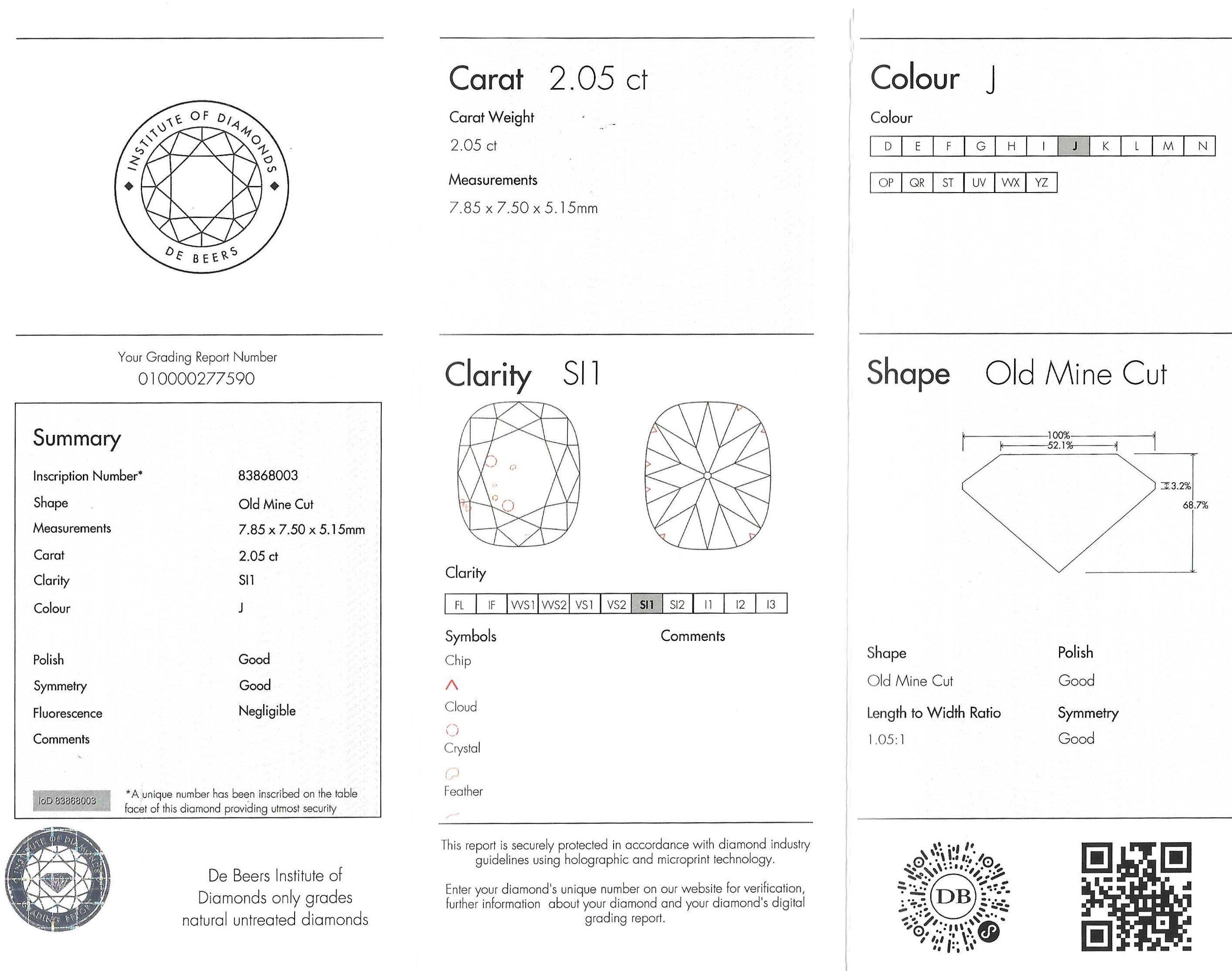 Accompanied by a De Beers Institute of Diamonds grading report. A unique number has been inscribed on this diamond providing utmost security.