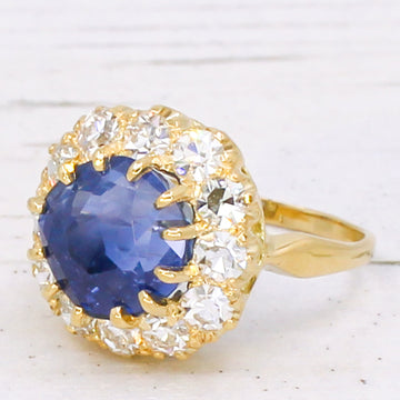 [message]A frankly exquisite antique sapphire and diamond ring. The sapphire in the centre - certified as natural, unheated and originating from Ceylon (Sri Lanka) is a rich and regal blue. The stone is claw set in yellow gold and surrounded by twelve high white eight-cut diamonds in a coronet cluster setting. On a slender 18k yellow gold ring with spear-shaped shoulders.