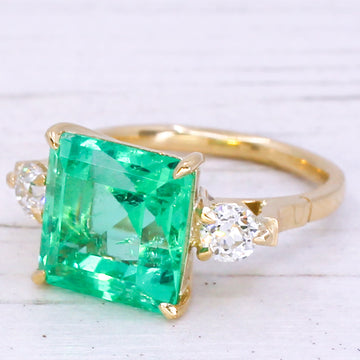 The bright green of the centre is highlighted by the whiteness of the two 0.30 carat (approx.) old cut diamonds either side. With ornate - but unfussy - detailing in the gallery, leading to a slim 18k yellow gold shank.