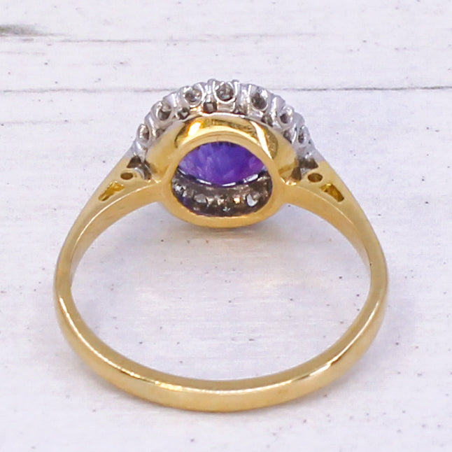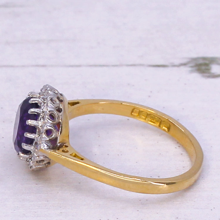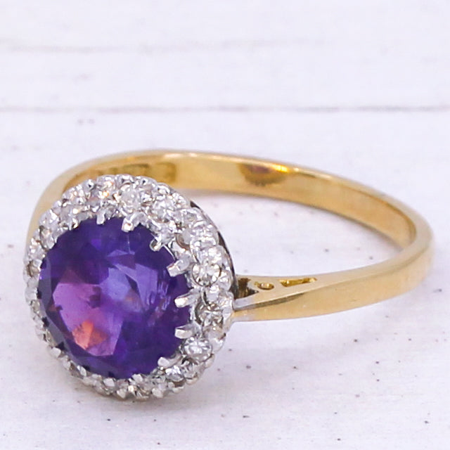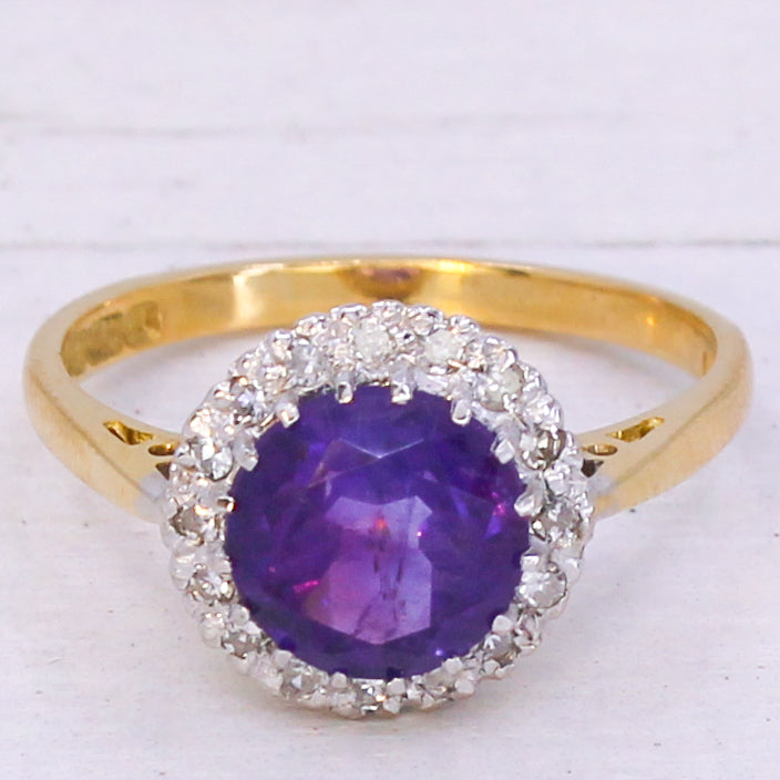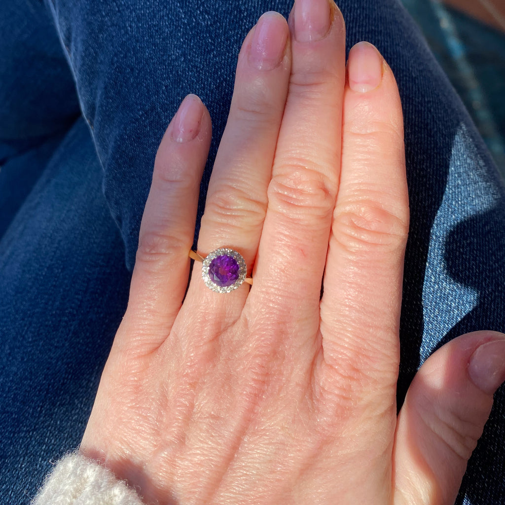 A wonderfully pretty vintage amethyst ring. The round amethyst in the centre is a deep, regal purple and is surrounded by 16 eight-cut diamonds in an 18k white gold coronet setting. On a slender 18k yellow gold shank. Clear hallmarks from the London Assay, dated 1975.